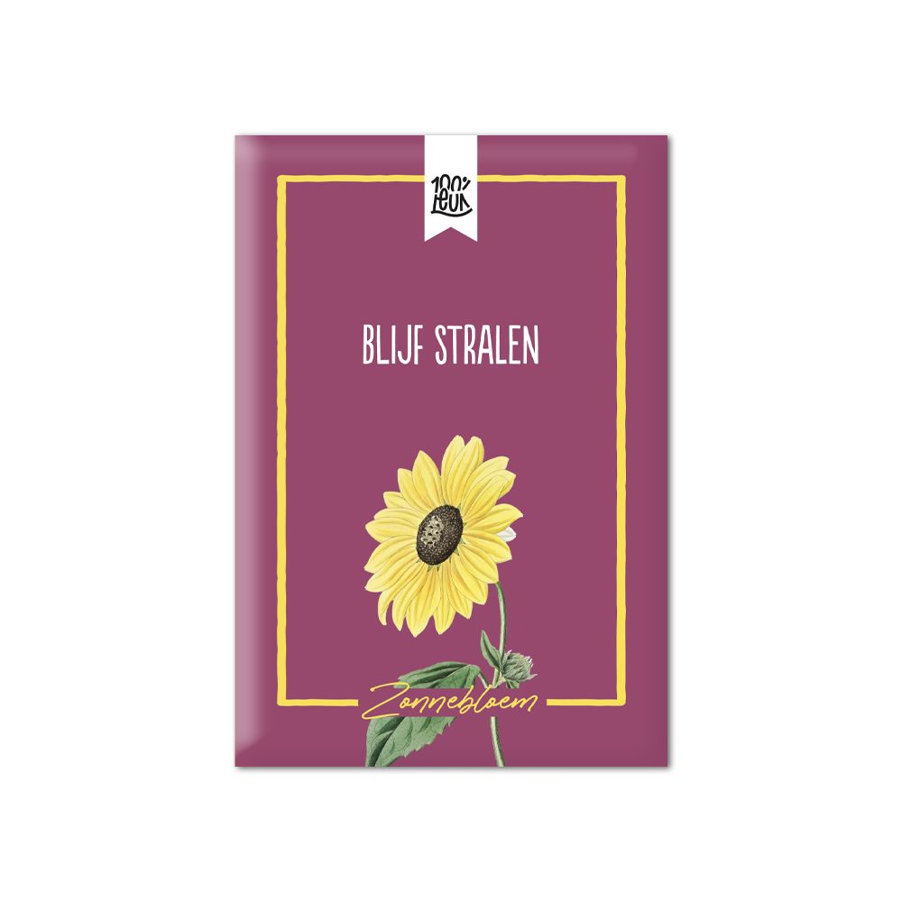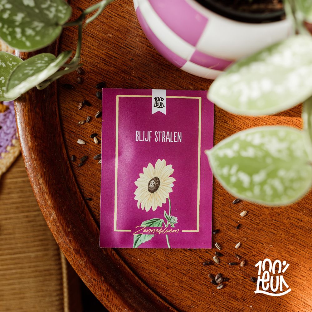 Geef een beetje natuur met een persoonlijke boodschap. Dit kleurrijke bloemenzakje met de tekst ‘Blijf stralen’ bevat zonnebloemzaadjes. Een perfect geschenk om iemand te inspireren, te bedanken of simpelweg een glimlach op haar gezicht te toveren. Plant de zaadjes tussen maart en juni en zie ze opbloeien, terwijl de boodschap van positiviteit altijd in de lucht blijft hangen.