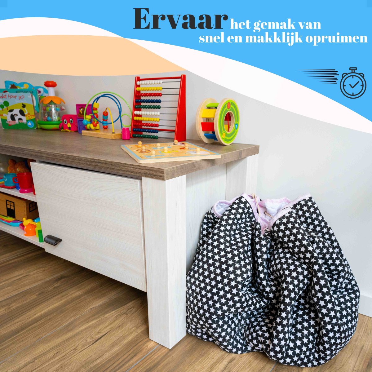 Dit 10mm dik multifunctionele speelkleed is gemaakt van een hoogwaardig textiel, waardoor je kind heerlijk kan spelen op het gehele oppervlakte van de speelmat. Door het bijgeleverde koord is het kleed tevens te gebruiken als opbergzak, om binnen een paar seconden al het rondslingerend speelgoed op te bergen.