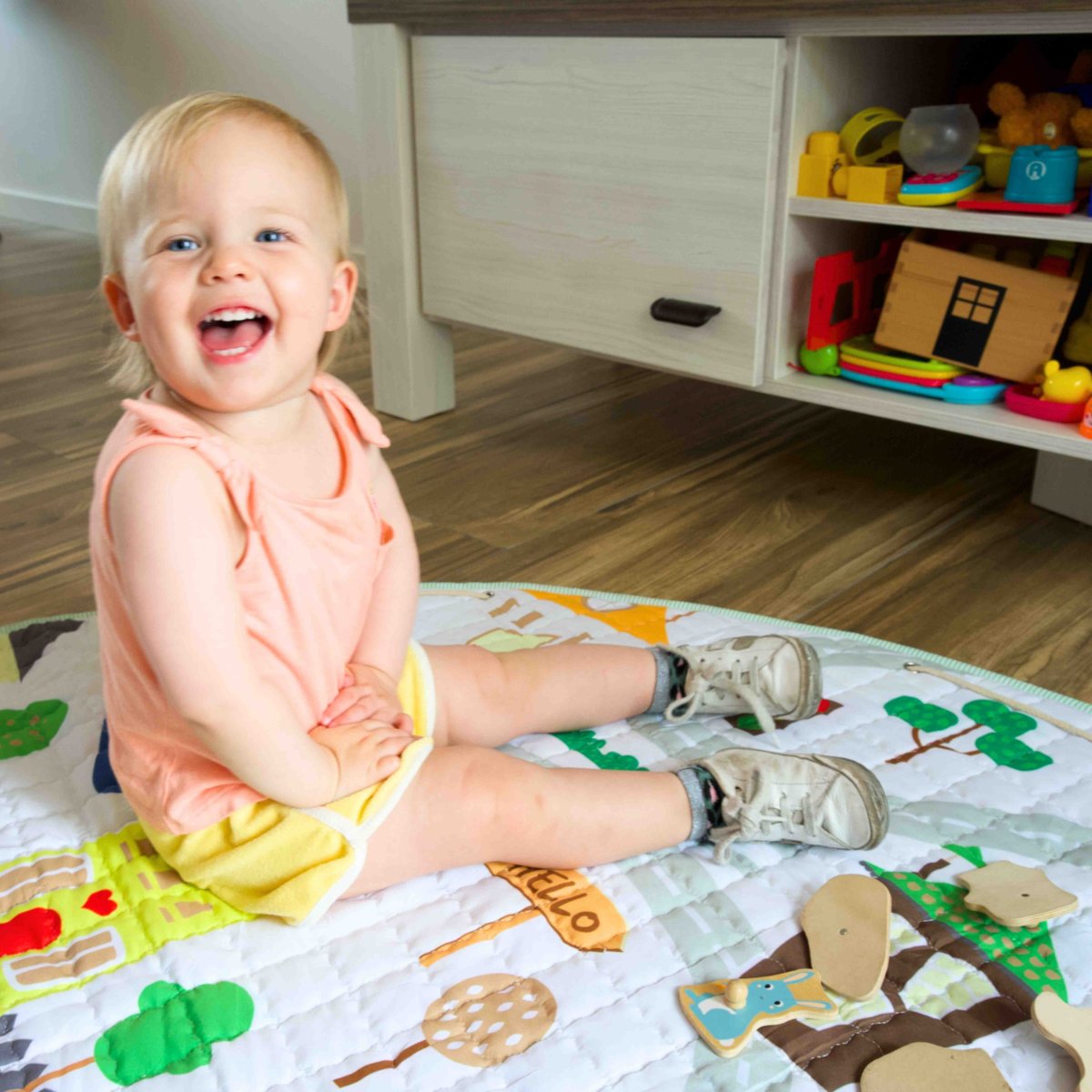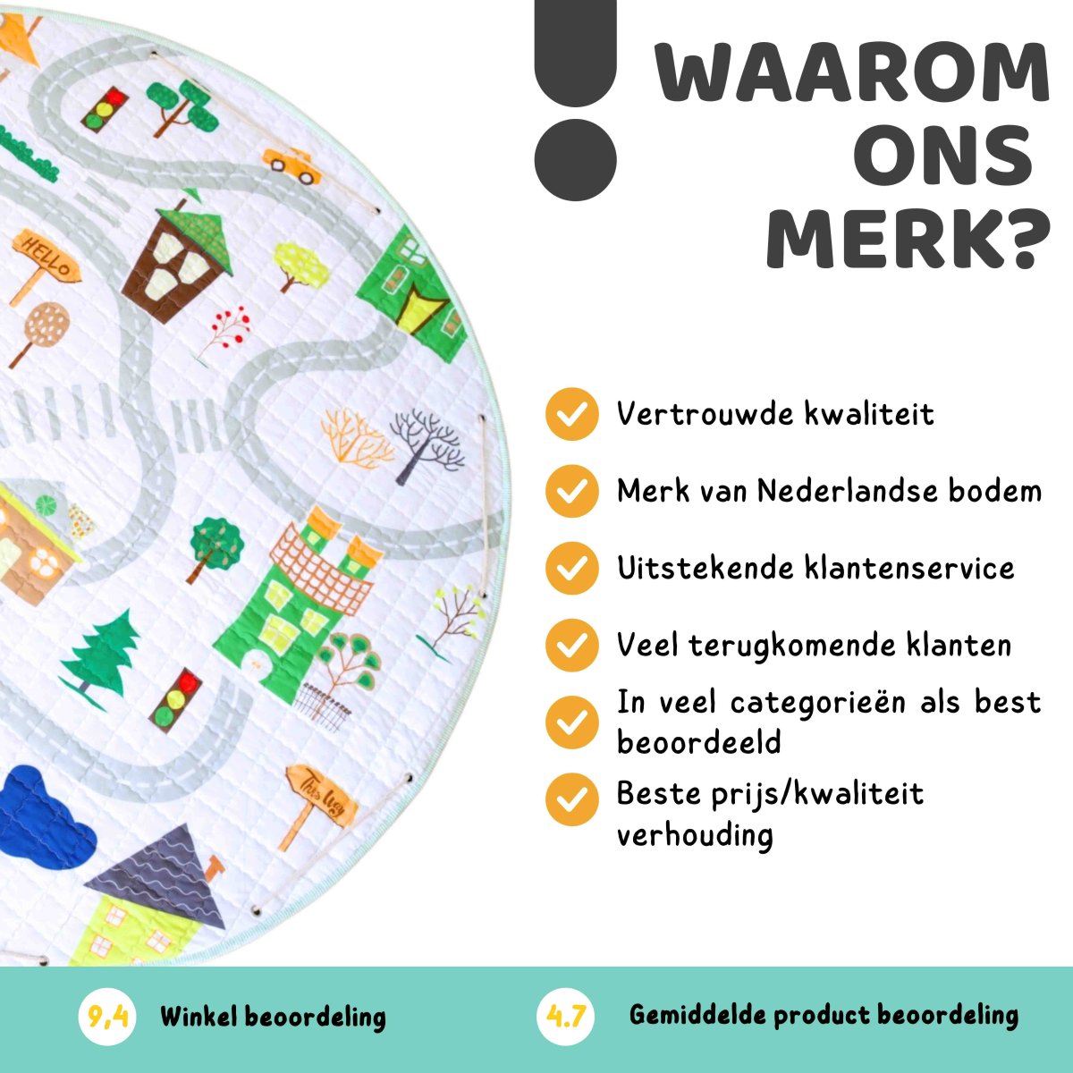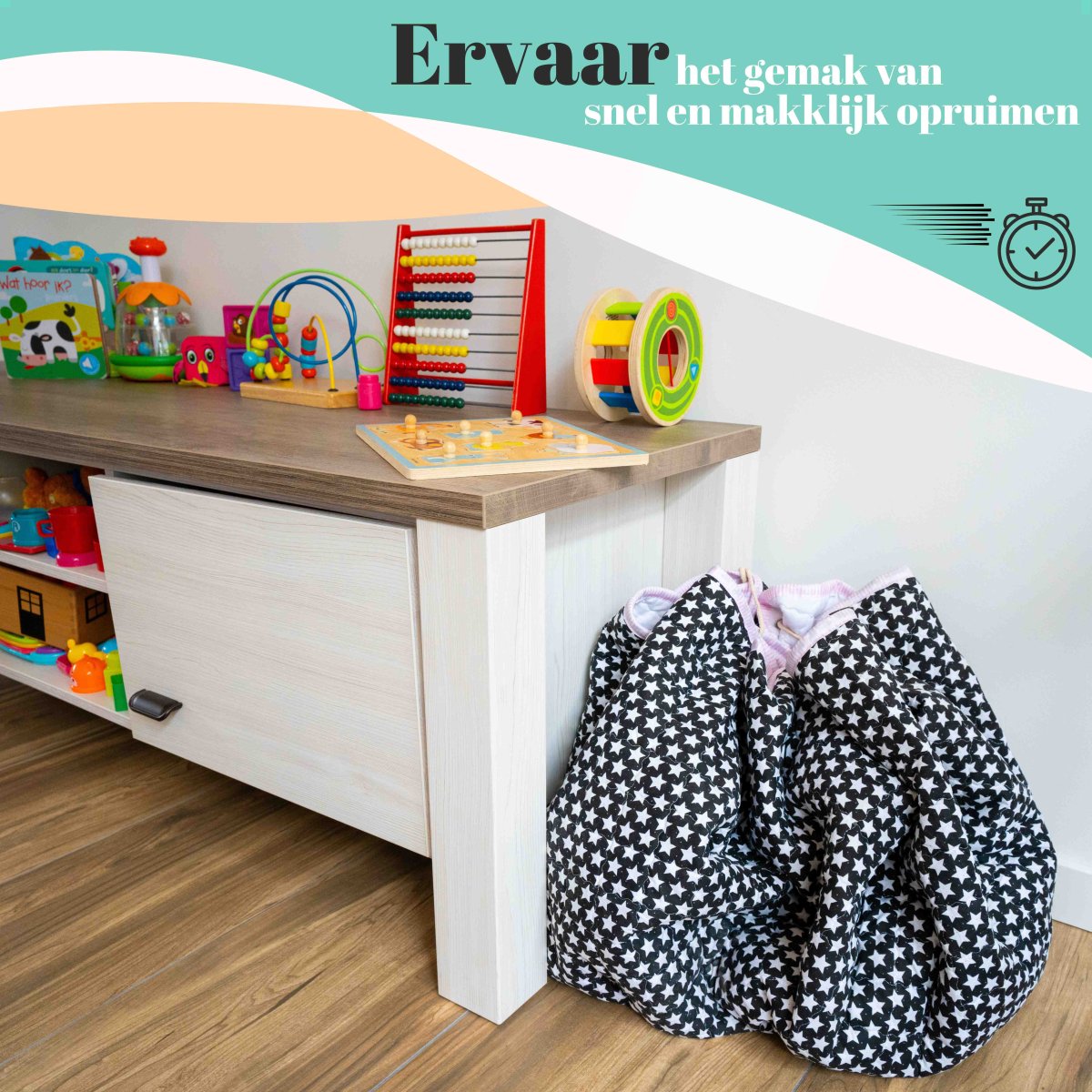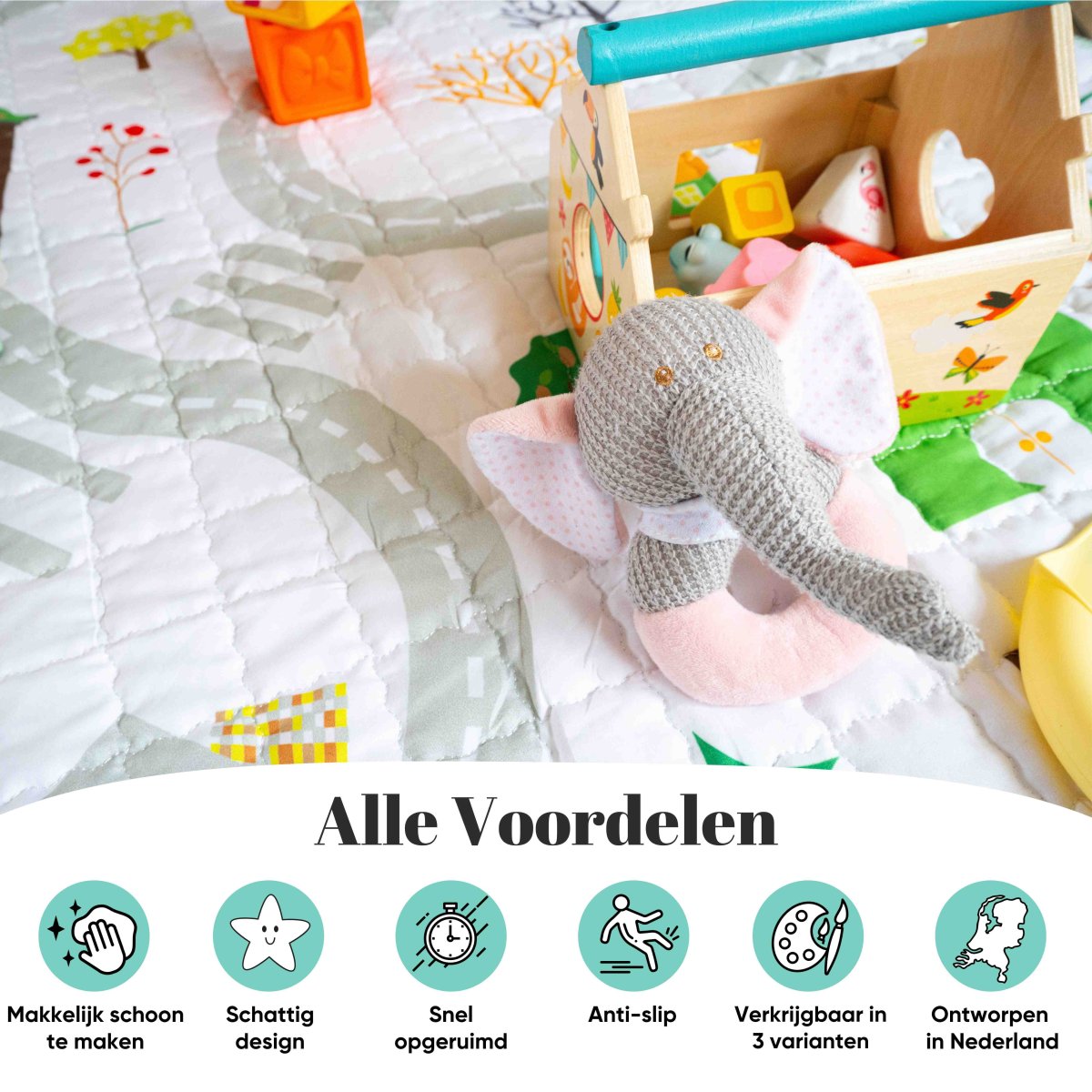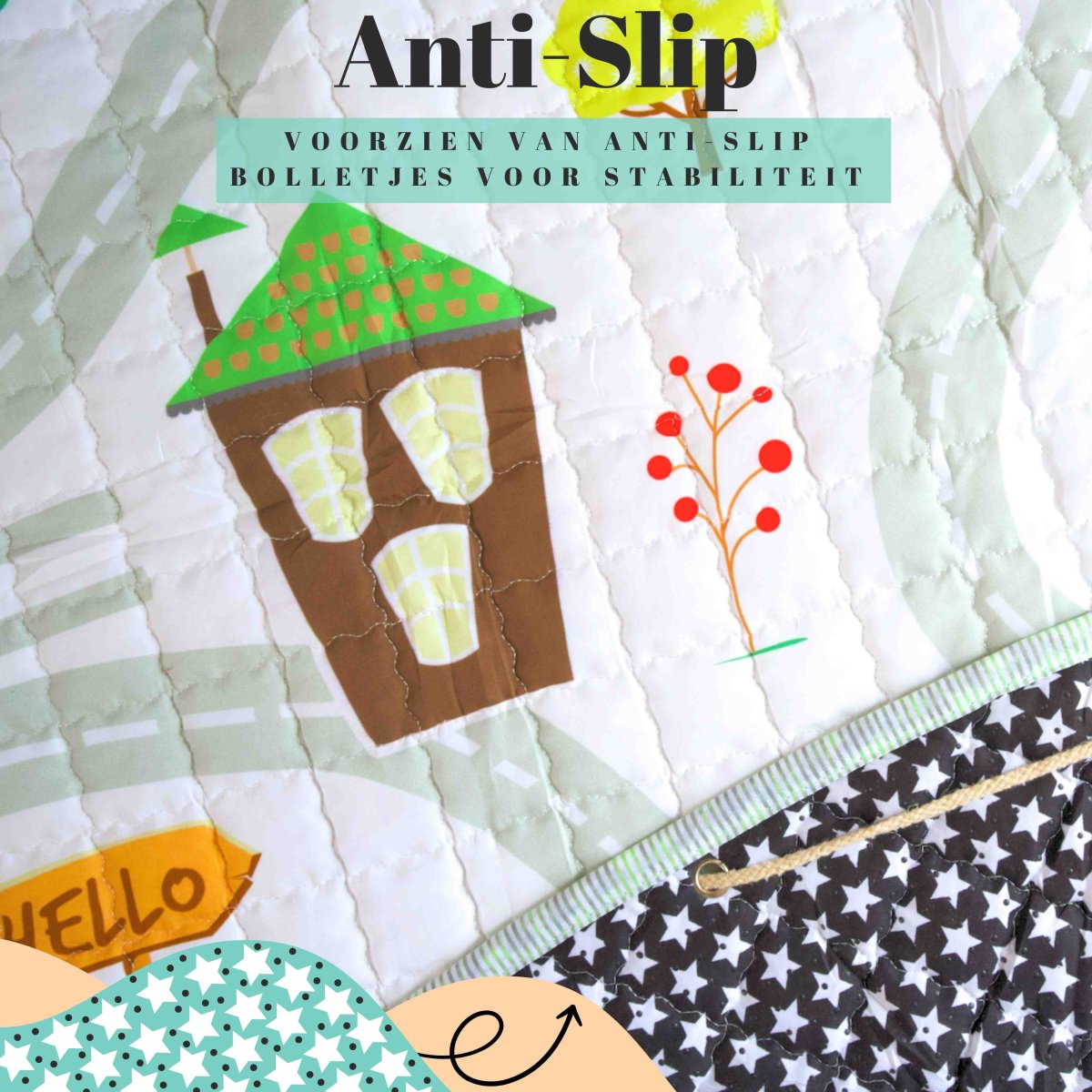 Dit 10mm dik multifunctionele speelkleed is gemaakt van een hoogwaardig textiel, waardoor je kind heerlijk kan spelen op het gehele oppervlakte van de speelmat. Door het bijgeleverde koord is het kleed tevens te gebruiken als opbergzak, om binnen een paar seconden al het rondslingerend speelgoed op te bergen.
