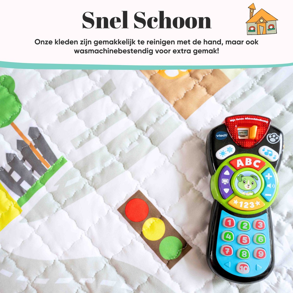 Het kleed is te reinigen in de wasmachine. En wordt geleverd in een PVC tas om het kleed makkelijk in op te bergen, indien je het kleed alleen als vloerkleed of speelmat gebruikt.