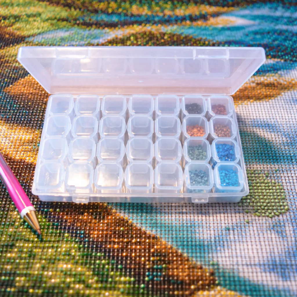Besteed minder tijd aan het zoeken naar de diamant die je nodig hebt en meer tijd aan het maken van jouw meesterwerk met behulp van onze doorzichtige 28-delige opbergdoos.