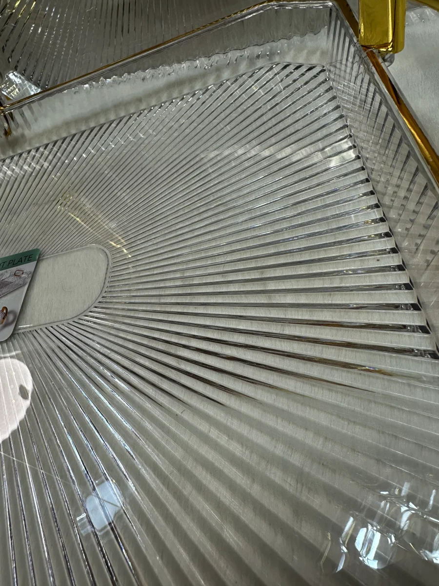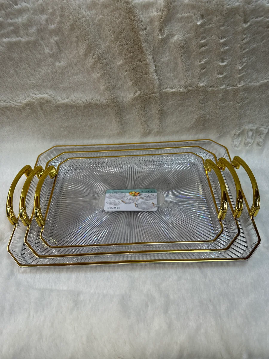 Deze chique 3-delige dienbladenset combineert functionaliteit en luxe design. Gemaakt van hoogwaardig acrylic plastic met gouden details, zijn deze dienbladen ideaal voor het serveren van hapjes, drankjes of als decoratief element. De goudkleurige handvatten zorgen voor een stevige grip en een elegante uitstraling.