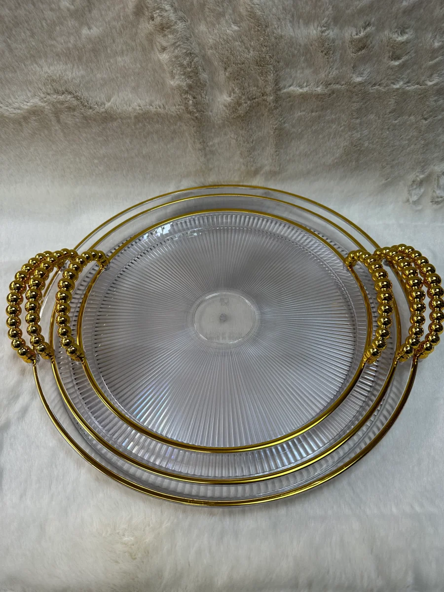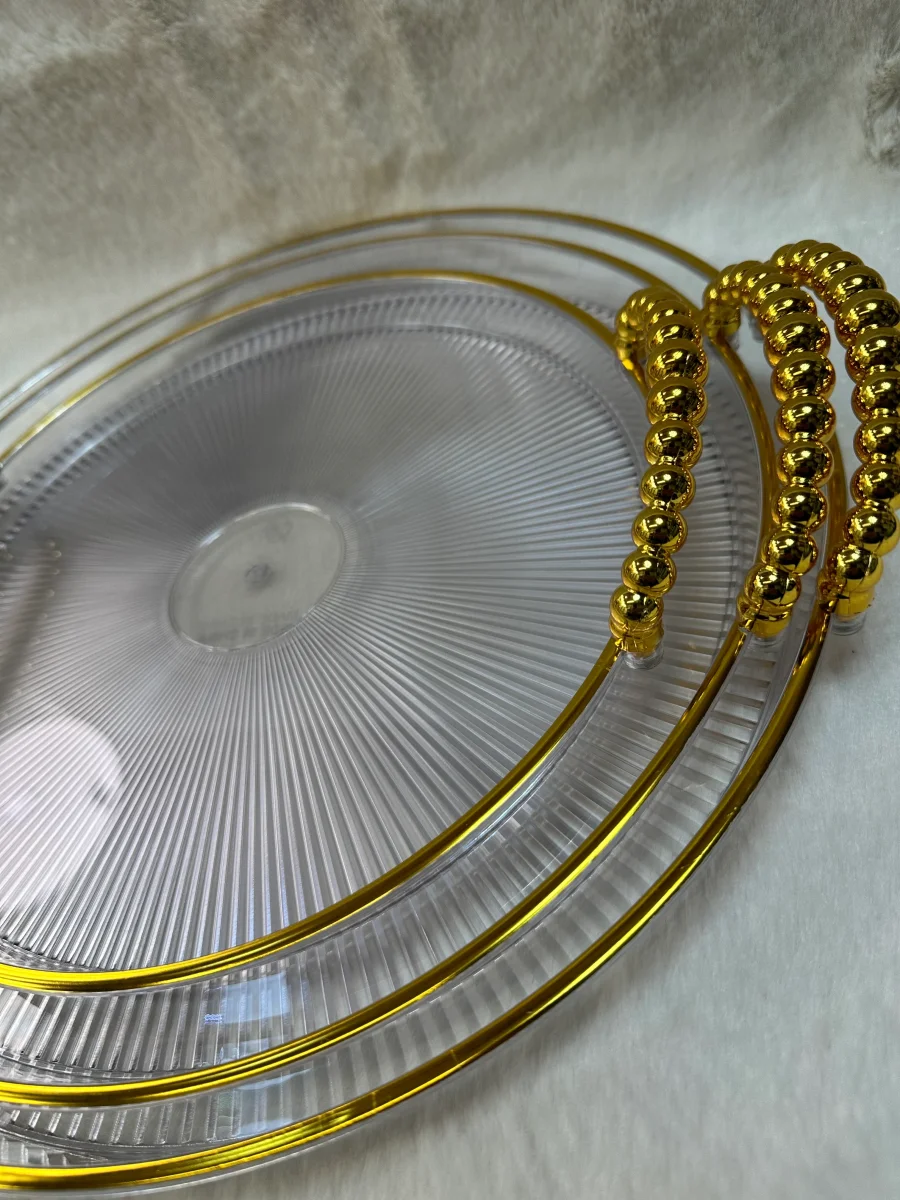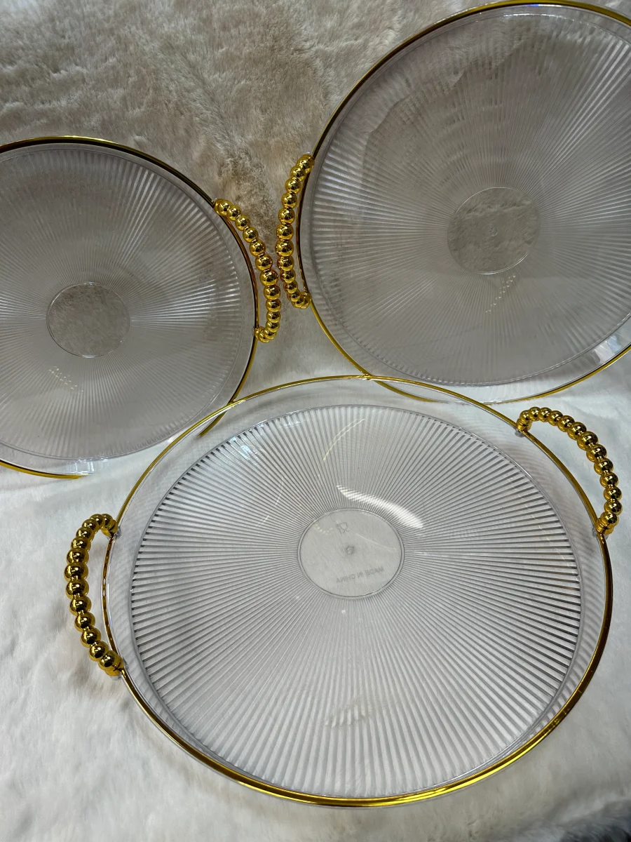 Deze luxe 3-delige dienbladenset combineert stijl en functionaliteit in een elegant design. Gemaakt van hoogwaardig acrylic plastic met gouden details, zijn deze dienbladen perfect voor het serveren van hapjes, drankjes of decoratieve items. De goudkleurige handvatten zorgen voor een comfortabele grip en een chique uitstraling.