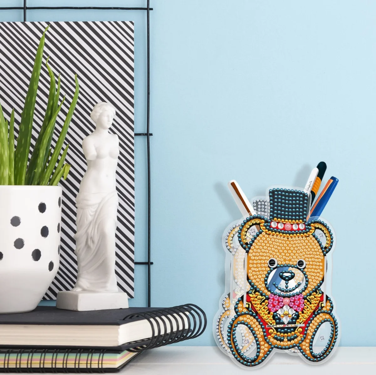 Deze te leuke 3D Diamond Painting Decoraties bestaan uit een plexiglas onderplaat met verschillende onderdelen die in de onderplaat gestoken moeten worden waardoor het 3D effect ontstaat. Hierin kan je ook bijvoorbeeld potloden of andere accessoiries opbergen.