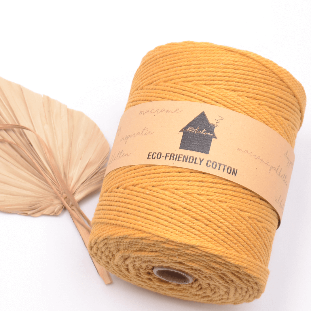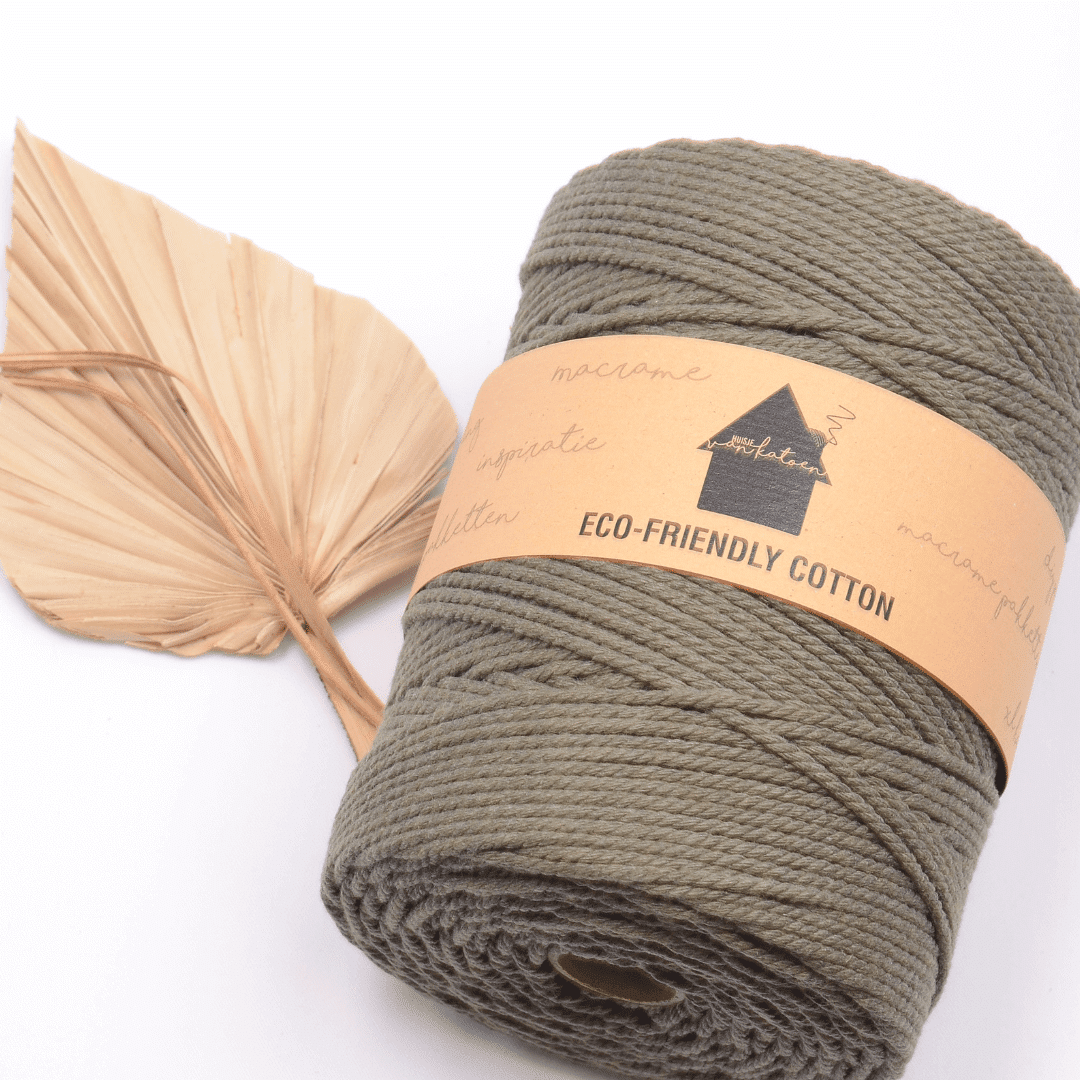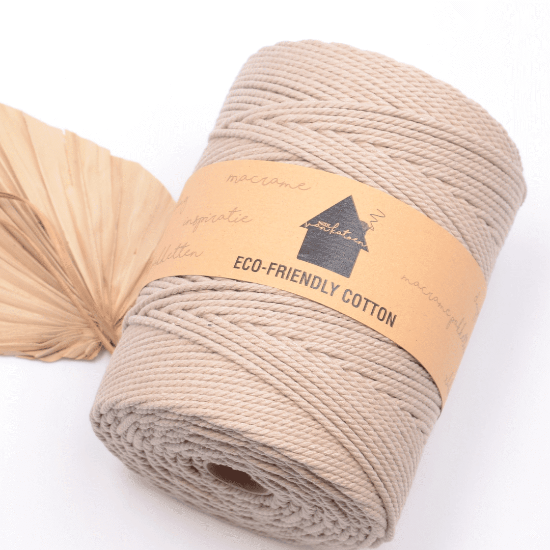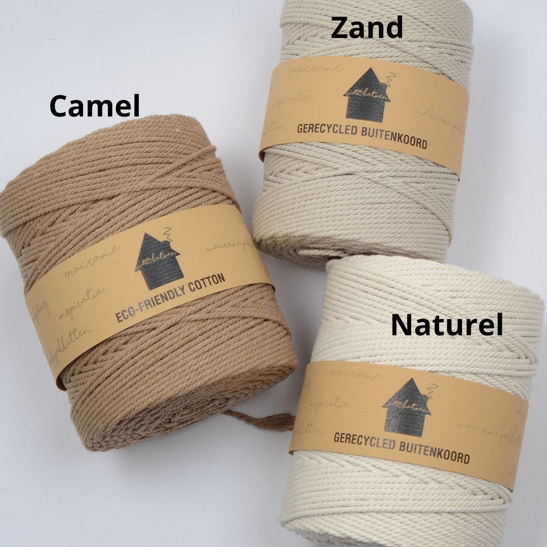 Het macramétouw wordt geproduceerd met eco-katoen garens of gerecycleerde garens van hoge kwaliteit. Geregenereerd katoen wordt verkregen uit katoenresten van kledij, stoffen, enz. Door verschillende tinten te mengen ontstaan prachtige kleuren. Dit proces levert ons het meest duurzame koord op de markt op. Door dit recycling- en productieproces kunnen er sporen van polyester aanwezig zijn en kunnen de kleuren per batch enigszins variëren. Het gaat hier om een natuurproduct waardoor ook de dikte van de draad enigszins kan afwijken. Rekening houdend met de milieu-impact van de productie van nieuw katoen, zal onze eco-versie een aanzienlijke positieve impact hebben op de totale productduurzaamheid. De garens hebben een Oeko-Tex certificaat en zijn dus vrij van onderdelen die schade berokkenen aan mens of gezondheid.