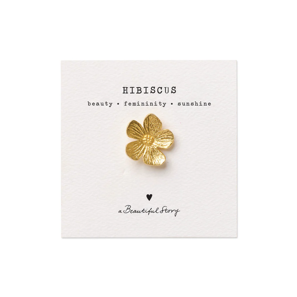 De Broche Hibiscus Verguld van A Beautiful Story is een handgemaakte broche van verguld messing met een hibiscus symbool. De afmeting van de kaart is 7,4 x 7,4 centimeter en de grootte van de broche is 2,5 centimeter.