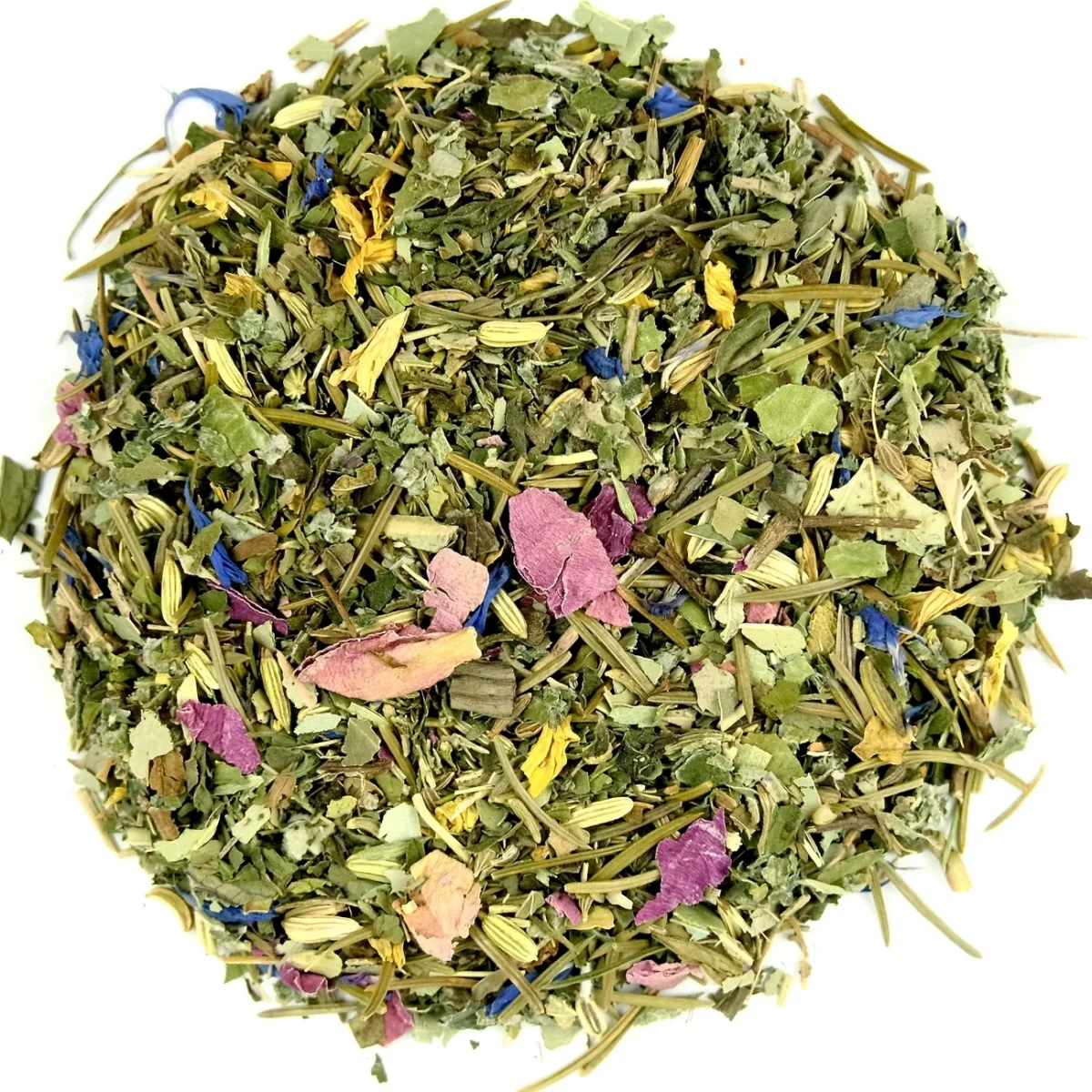 Ingrediënten: Venkel, eucalyptusbladeren, pepermunt, sparrennaalden, anijs, braambesbladeren, frambozenbladeren, groene munt, tijm, rozemarijn, ribbladeren, saliebladeren, zonnebloembloesem, pioenbloesem, gentiaanwortel, vlierbloesem, korenbloembloesem