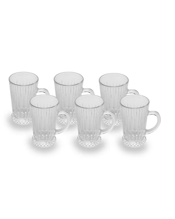 De Amore theeglazen met handvat combineren elegantie en praktisch gebruik in één tijdloos ontwerp. Deze set bestaat uit zes glazen met een inhoud van 210 ml, ideaal voor het serveren van thee, koffie of warme dranken. Het stijlvolle verticale lijnpatroon en de sierlijke voet geven elk glas een luxe uitstraling, terwijl het stevige handvat zorgt voor een comfortabele grip.