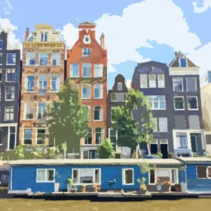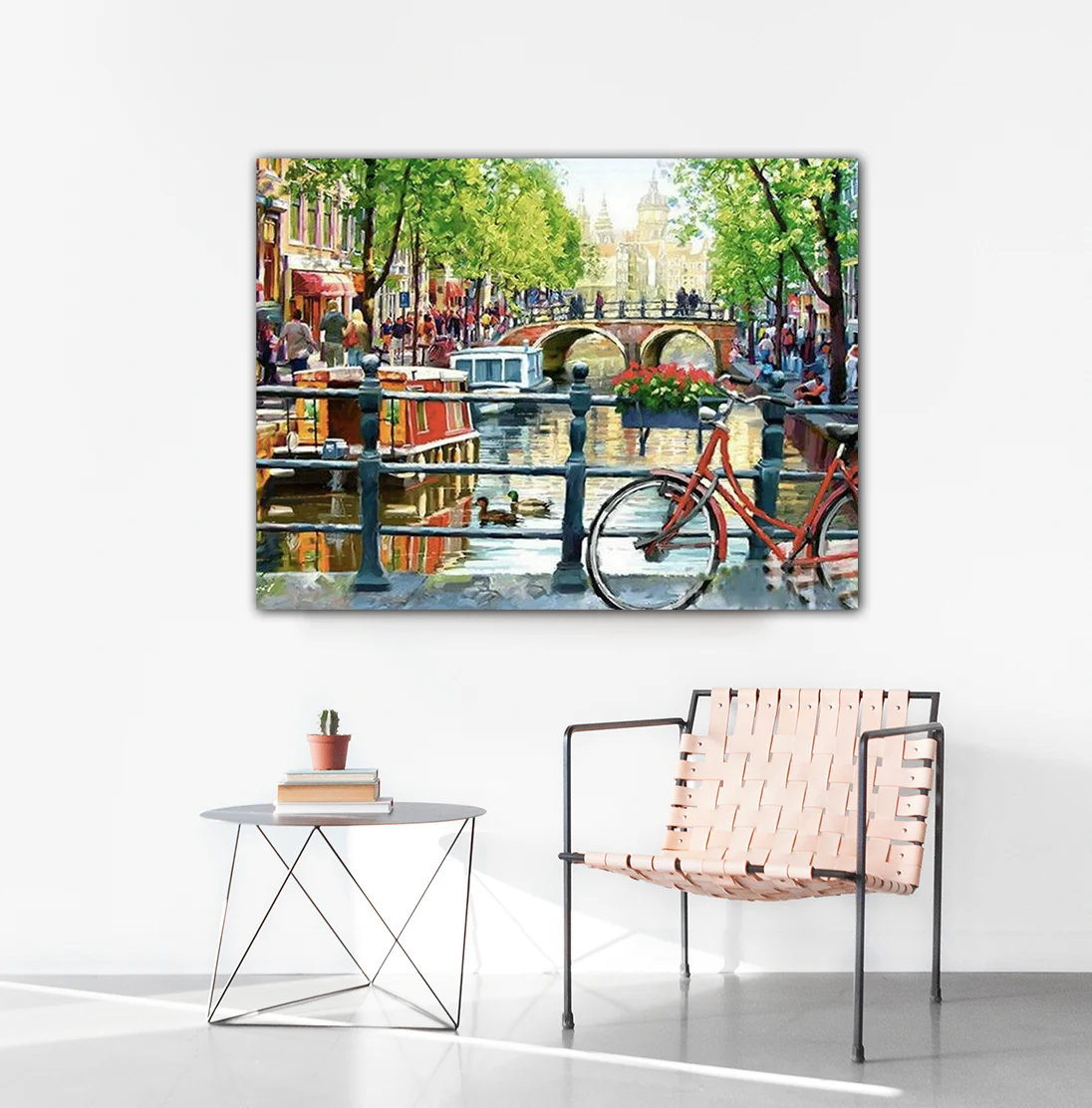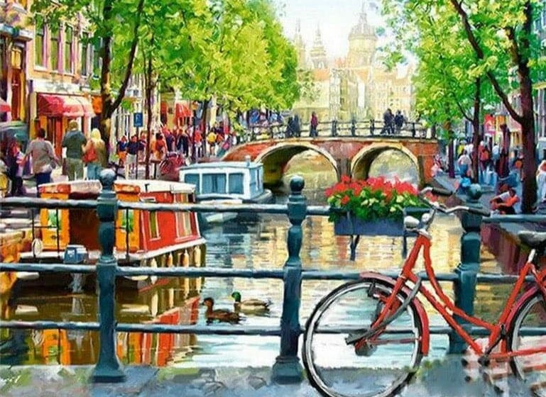 Deze levendige diamond painting vangt de charme van een zonnige dag in het hart van Amsterdam. Op de voorgrond staat een rode fiets geparkeerd aan de gracht, met een mand vol bloemen 🌺, terwijl eenden rustig over het water glijden 🦆. Op de achtergrond zie je gezellige grachtenpanden, een klassieke brug, een rondvaartboot en flanerende mensen die genieten van de stad 🌉🚤. De groene bomen weerspiegelen in het water, en de sfeer is warm, levendig en vol Nederlandse flair 🇳🇱✨.