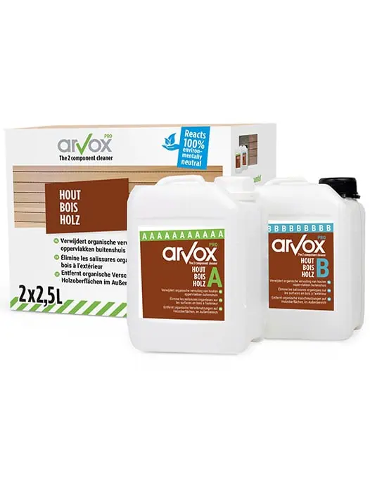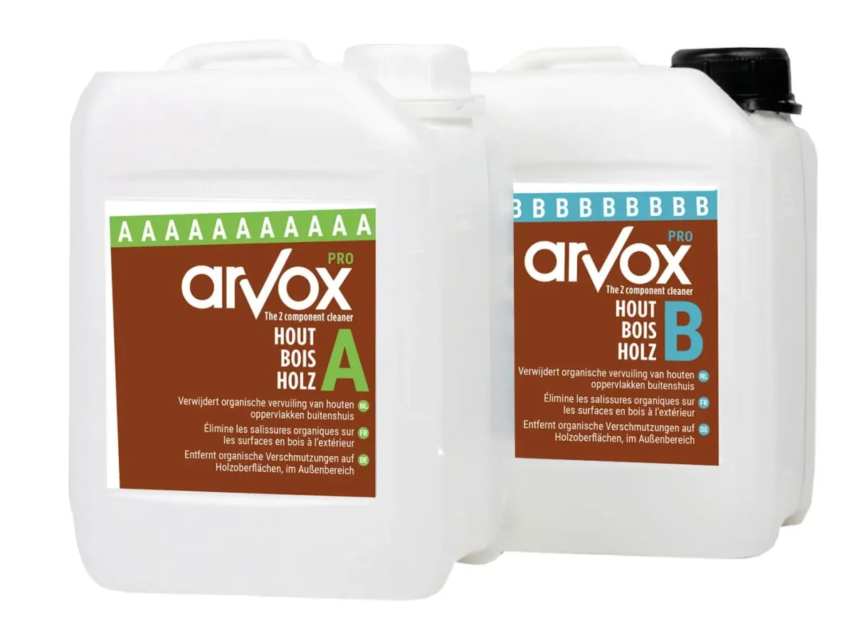 Arvox-Pro Hout 2×2,5L is dé gepatenteerde 2-componenten reiniger voor het efficiënt en milieuvriendelijk reinigen van houten oppervlakken buiten, zoals houten vlonders, houten tuinmeubelen en houten gevels.