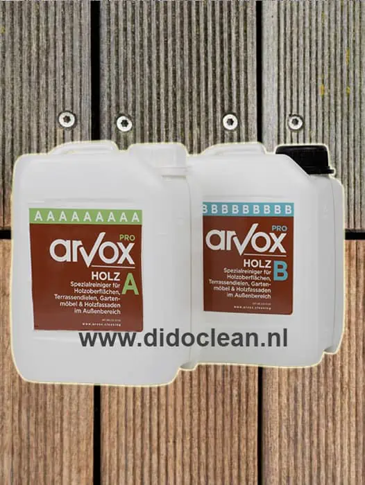 Arvox-Pro Hout 2x10L is dé gepatenteerde 2-componenten reiniger voor het efficiënt en milieuvriendelijk reinigen van houten oppervlakken buiten, zoals houten vlonders, houten tuinmeubelen en houten gevels.