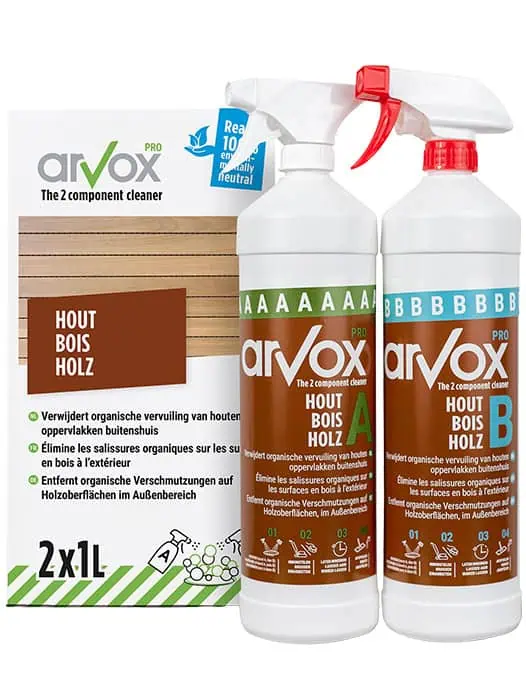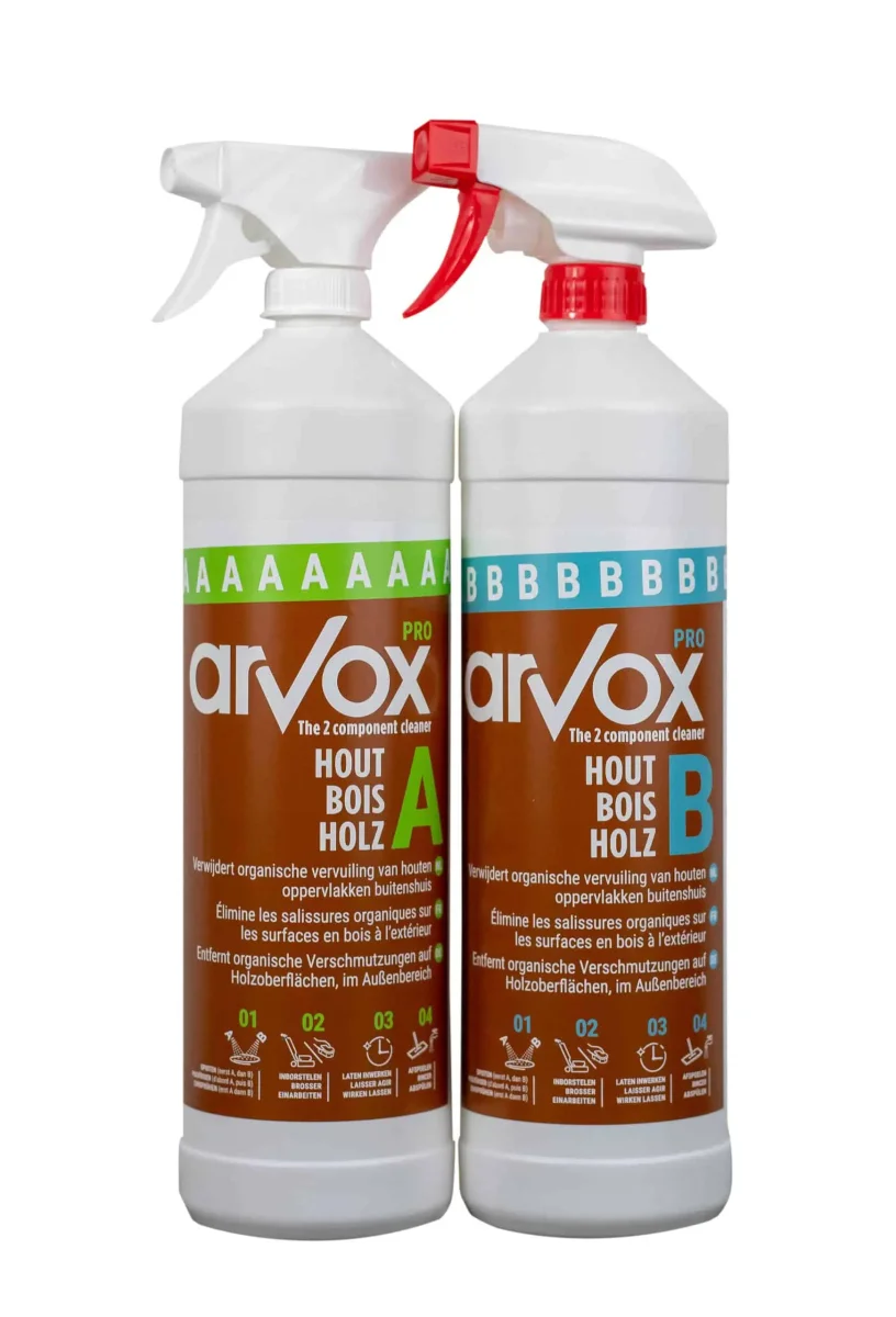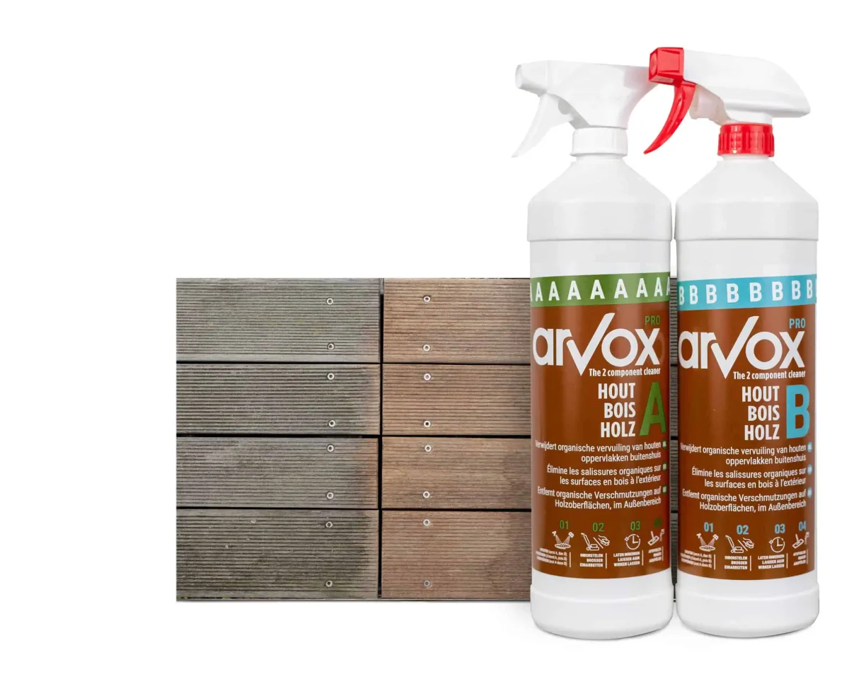 Arvox-Pro Hout 2x1L is dé gepatenteerde 2-componenten reiniger voor het efficiënt en milieuvriendelijk reinigen van houten oppervlakken buiten, zoals houten vlonders, houten tuinmeubelen en houten gevels.