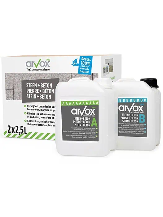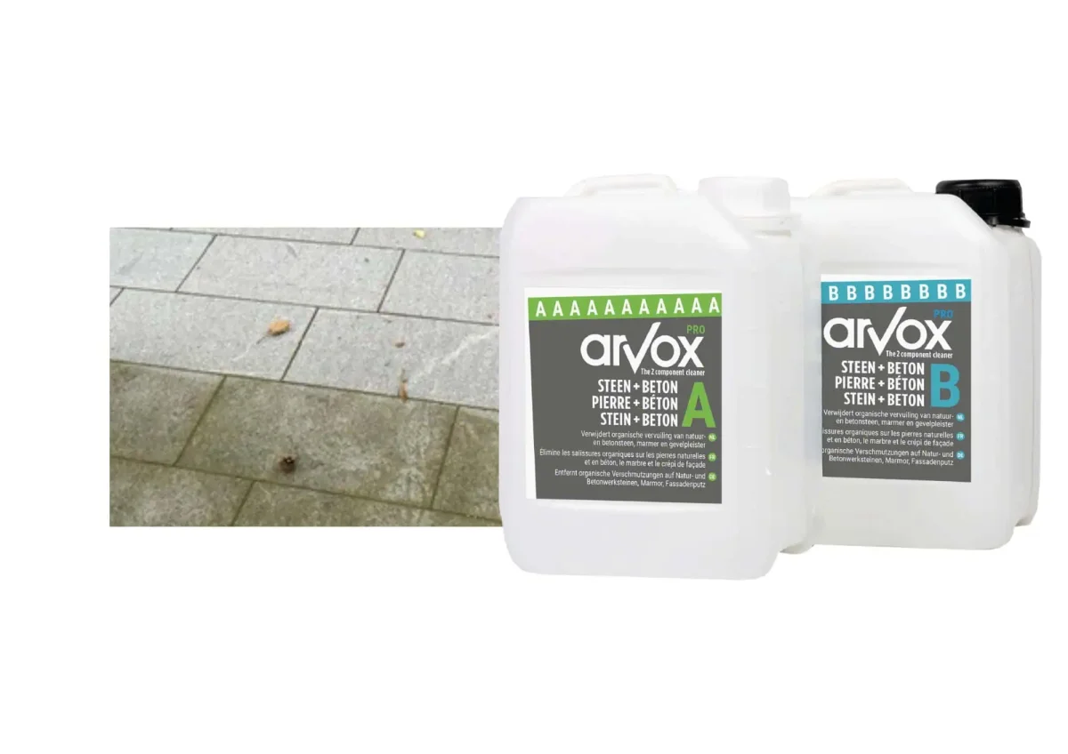 Arvox-Pro Steen & Beton 2×2,5L is dé gepatenteerde 2-componenten reiniger voor het efficiënt en milieuvriendelijk reinigen van stenen en betonnen oppervlakken binnen en buiten.