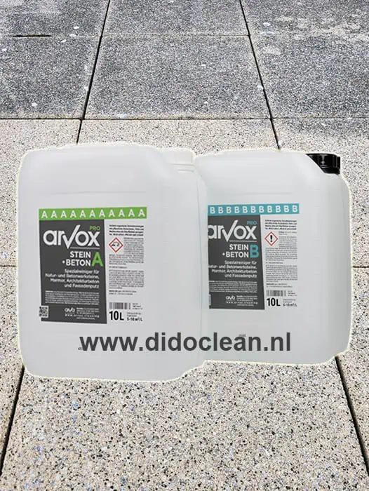 Arvox-Pro Steen & Beton 2x10L is dé gepatenteerde 2-componenten reiniger voor het efficiënt en milieuvriendelijk reinigen van stenen en betonnen oppervlakken binnen en buiten.