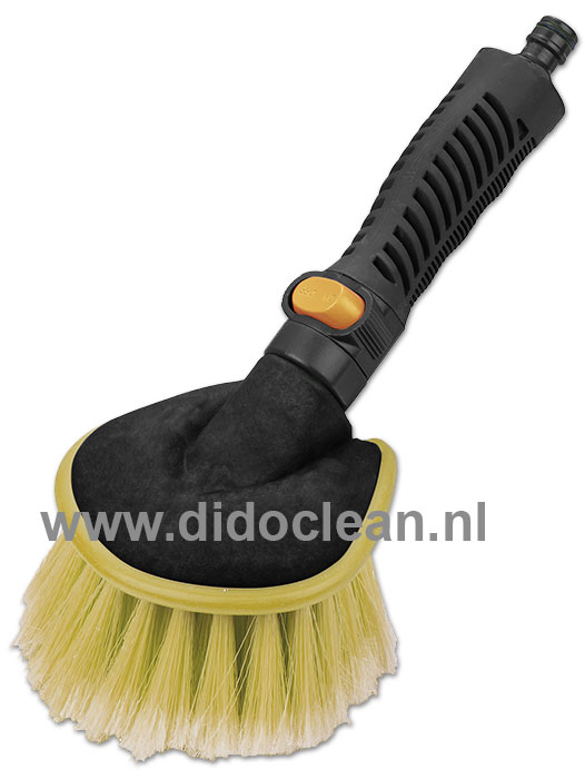 Autowasborstel 26cm met wateraansluiting en waterstop. Deze handborstel met ergonomisch handvat is voorzien van een gardena snelkoppeling waarmee u hem kunt aansluiten aan een tuinslang. De wasborstel is voorzien van een waterstop waarmee u de watertoevoer eenvoudig in en uit kunt schakelen. De wasborstel is voorzien van zachte haren.
