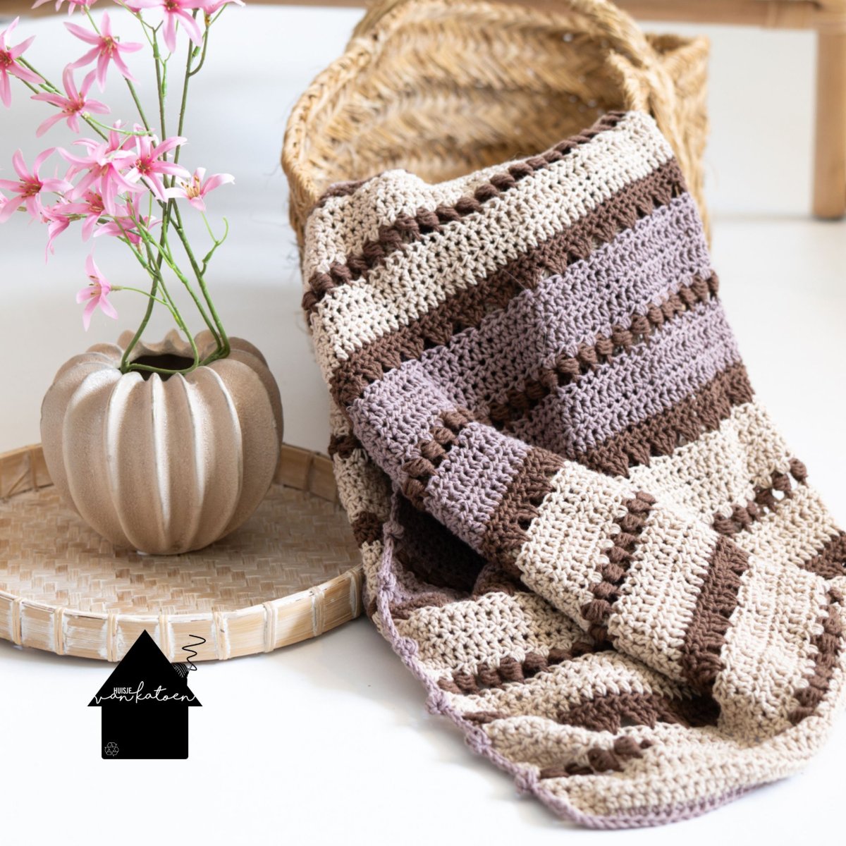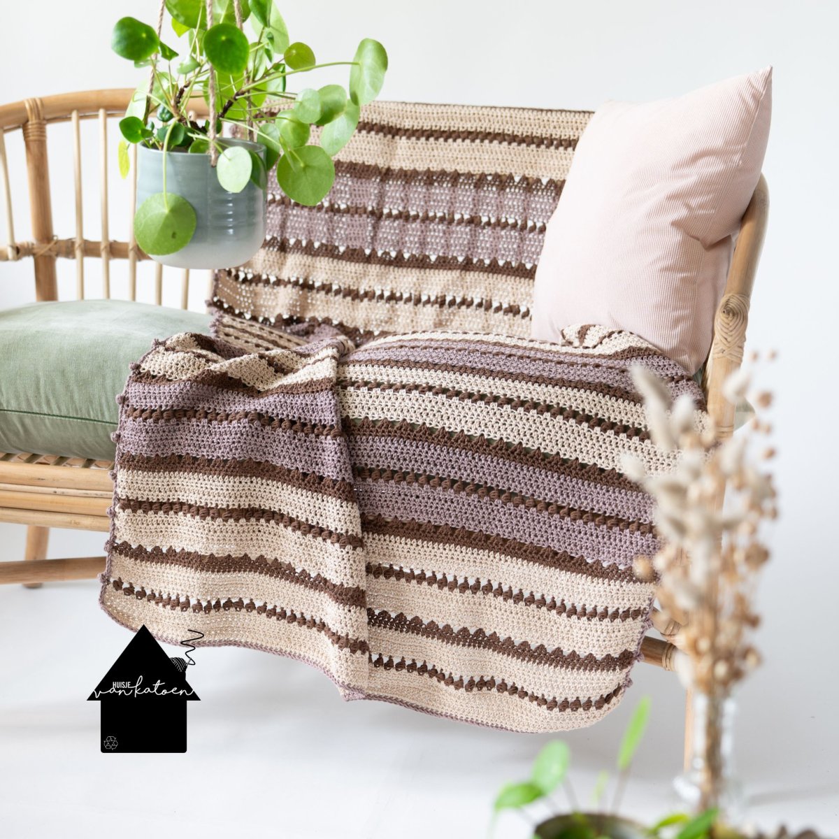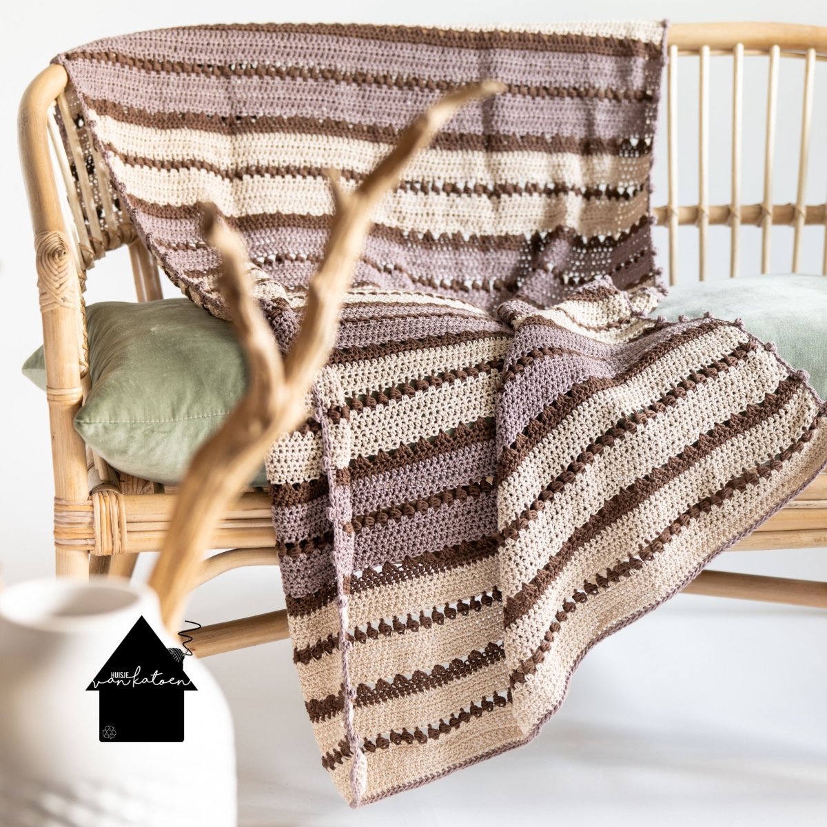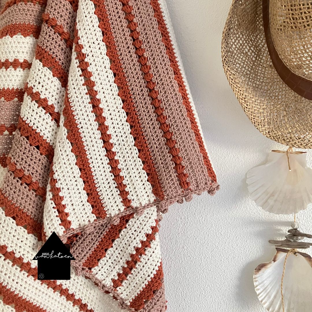 Het patroon is een herhaling van 12 toeren, je hebt ze zo onder de knie, dus niet heel ingewikkeld. Ik maakte de deken in 3 kleuren, maar je kunt hem ook in 2 kleuren maken of juist in heel veel kleurtjes. Zorg wel dat de accentstreepjes allemaal dezelfde kleur hebben, bij de rode deken is dat de terra kleur.