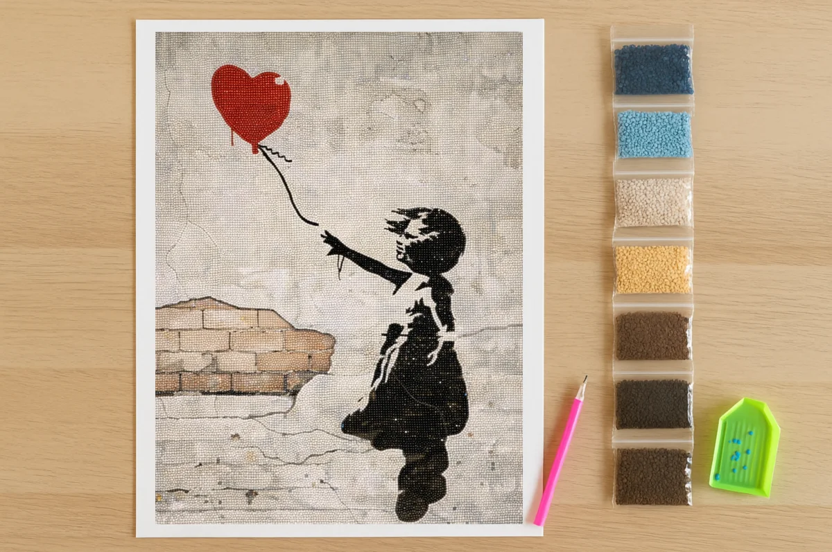 De combinatie van zwart-wit contrast met de felrode ballon maakt dit tot een eenvoudig maar diepzinnig ontwerp – perfect voor een unieke en betekenisvolle diamond painting.