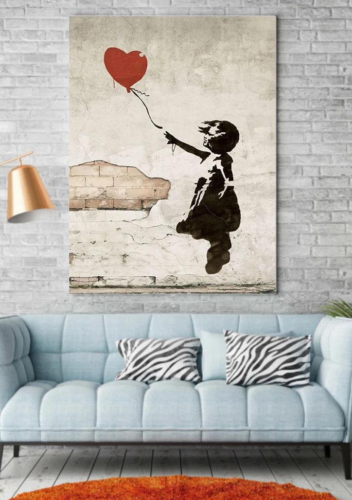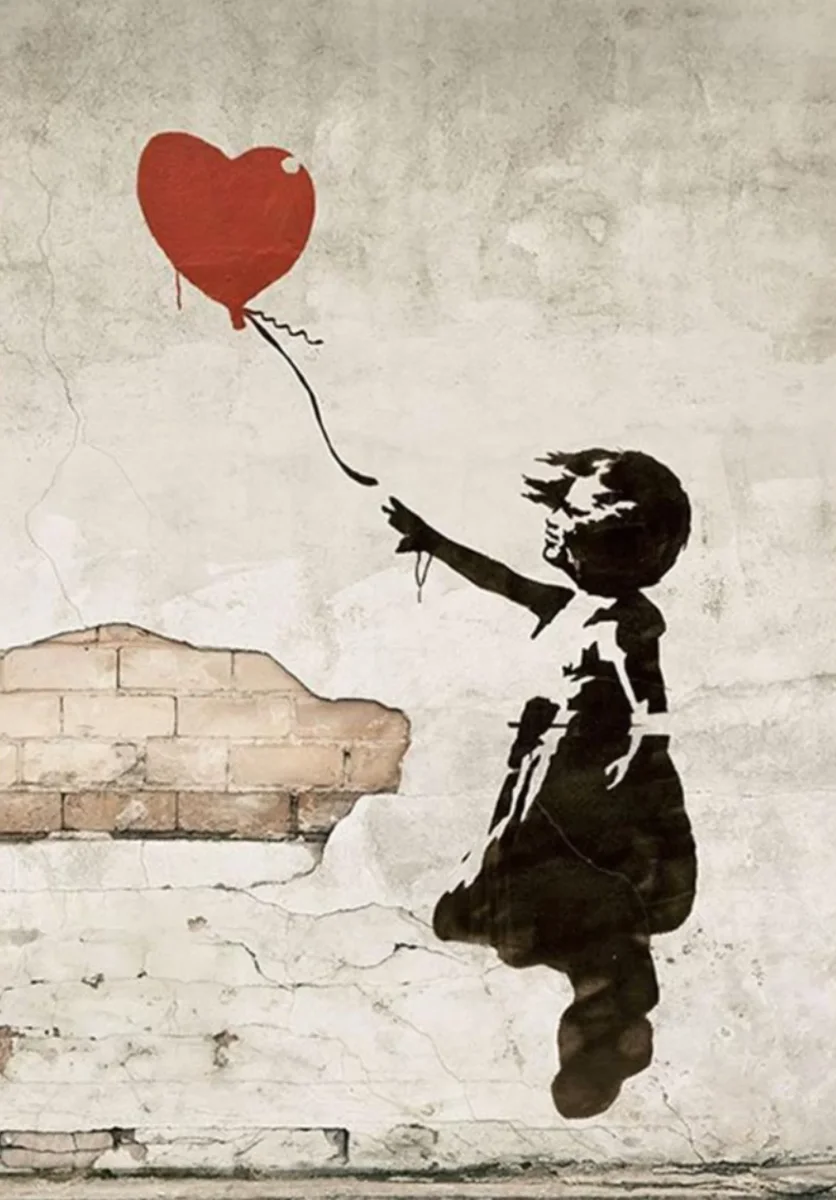 Deze iconische graffiti van Banksy toont een meisje dat reikt naar een wegvliegende ballon in de vorm van een rood hart – een krachtig en emotioneel beeld dat symbool staat voor hoop, verlies en verlangen.