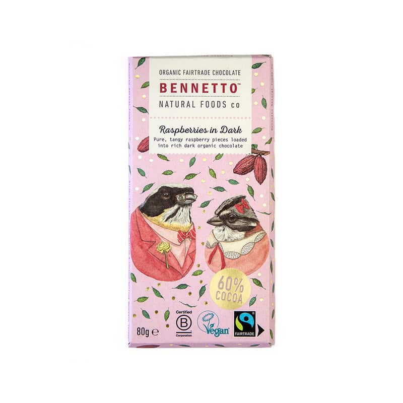 Ervaar de harmonie van Bennetto Dark Raspberries, waar 60% pure biologische chocolade samenkomt met de fruitige zoetheid van frambozen. Deze combinatie zorgt voor een frisse en levendige smaak die zowel liefhebbers van pure chocolade als fruitige accenten zal bekoren. Een elegante traktatie voor elke gelegenheid.