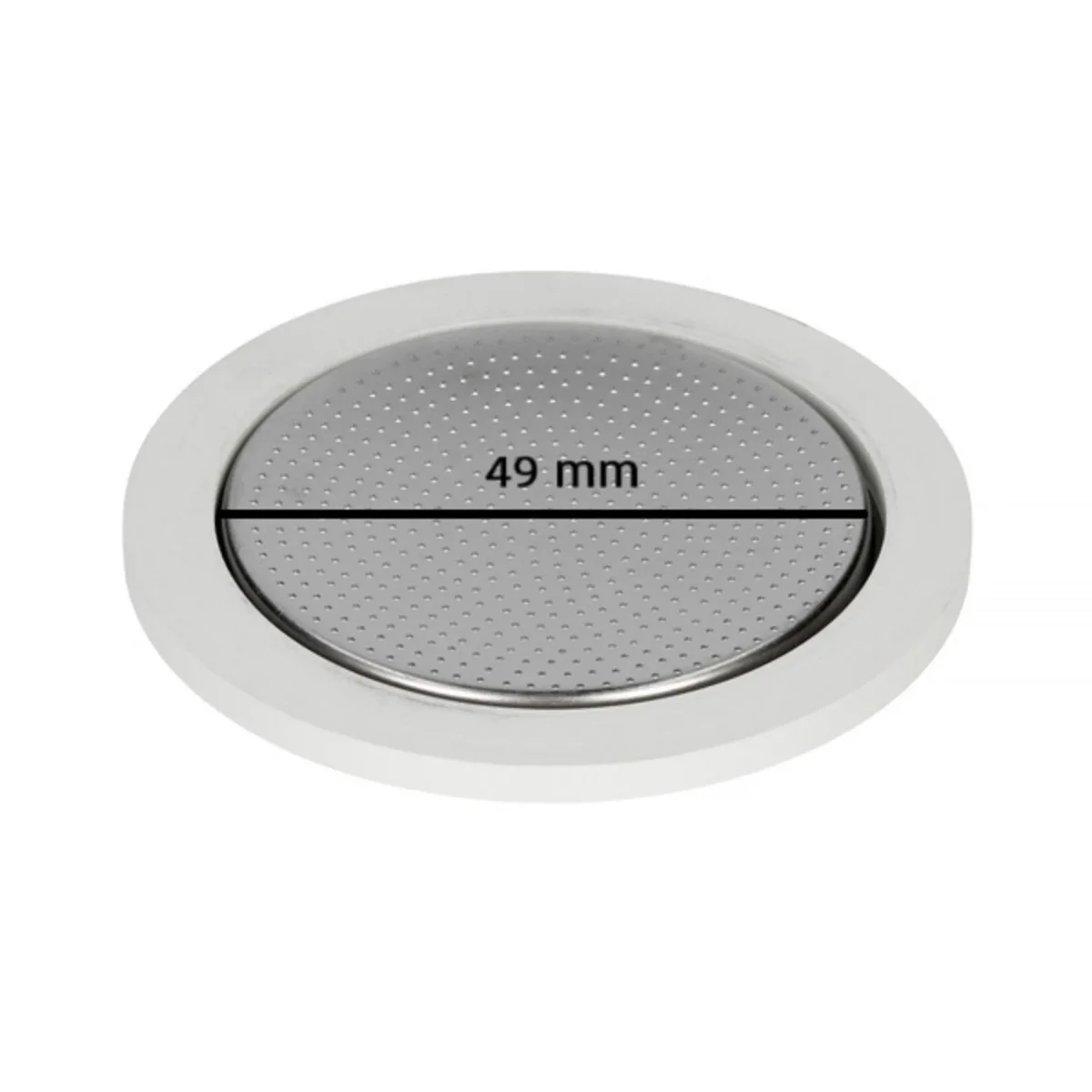 Het originele vervangingssetje met een filterplaatje voor de Bialetti Moka Express en Moka Induction, 3 en 4 kops. De set bestaat uit een aluminium filter en 3 rubberen ringen. De diameter van de binnenkant van de rubberen ring is 49 mm.