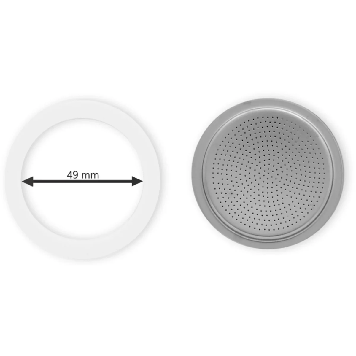Het originele vervangingssetje met een filterplaatje voor de Bialetti Brikka 2 kops, Moka induction 4 kops en Moka Express 4 kops. De set bestaat uit een aluminium filter en een siliconen ring. De diameter van de binnenkant van de rubberen ring is 49 mm.