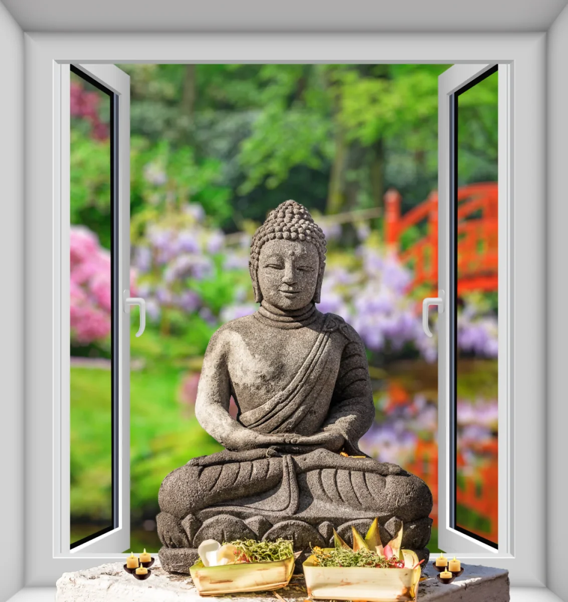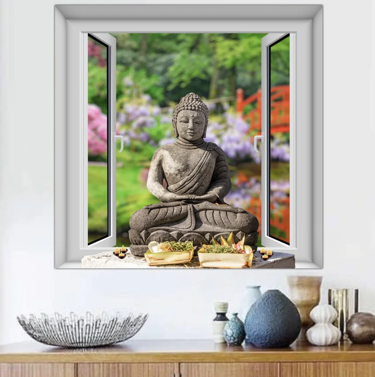 Deze serene diamond painting opent als een venster naar vrede en balans. Door het open raam zie je een gracieuze Boeddha 🧘♂️ in meditatiehouding, omringd door een kleurrijke Japanse tuin vol bloesems 🌸, groen 🌳 en een rode brug op de achtergrond 🌉. Elke fonkelende steen versterkt het gevoel van harmonie, kalmte en schoonheid — perfect om je eigen ruimte om te toveren tot een oase van rust ✨🙏