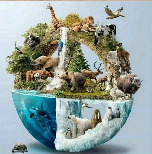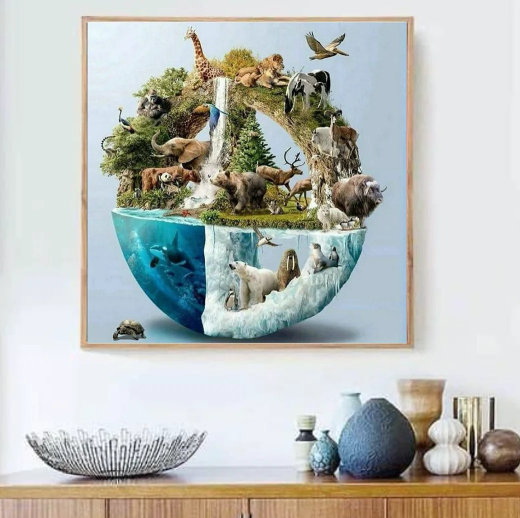 Deze adembenemende diamond painting toont de rijkdom van onze planeet in één krachtig beeld: een halve wereldbol vol leven, natuur en harmonie. Bovenop zie je een weelderige jungle vol wilde dieren zoals giraffen 🦒, olifanten 🐘, beren 🐻 en herten 🦌, met een bruisende waterval als middelpunt 🌊. Onderaan, in het ijzige deel van de wereld ❄️, leven ijsberen 🐾, orka’s 🐋, zeeleeuwen en pinguïns 🐧 in een bevroren paradijs.