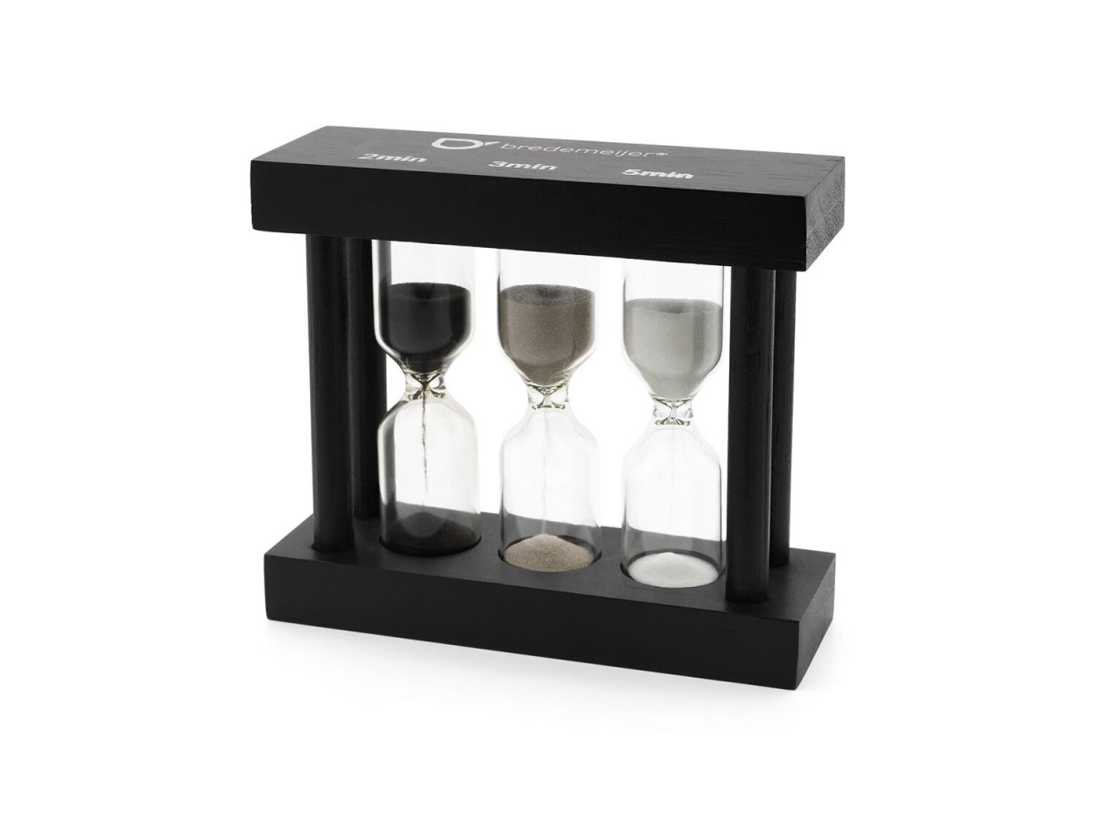 Altijd de juiste trektijd van je thee met deze handige tea timer. Hij bestaat uit drie zandlopers met een doorlooptijd van 2, 3 en 5 minuten. In een mooi zwart bamboe jasje.