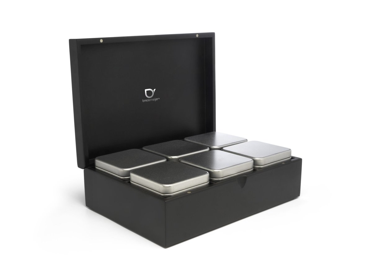 Bewaar je losse thee op stijlvolle wijze met deze zwarte Bredemeijer® theedoos. De theedoos is voorzien van 6 blikjes en speciaal ontwikkeld voor het bewaren van losse thee. Zo blijft de thee langer houdbaar en blijft de smaak behouden. Door het uitgeslepen gootje aan de voorzijde, is de deksel makkelijk te openen. De theedoos is gemaakt van bamboe en heeft een elegante uitstraling door de matte zwarte kleur. Een musthave voor de echte theeliefhebber! Verkrijgbaar in het wit, zwart en naturel.