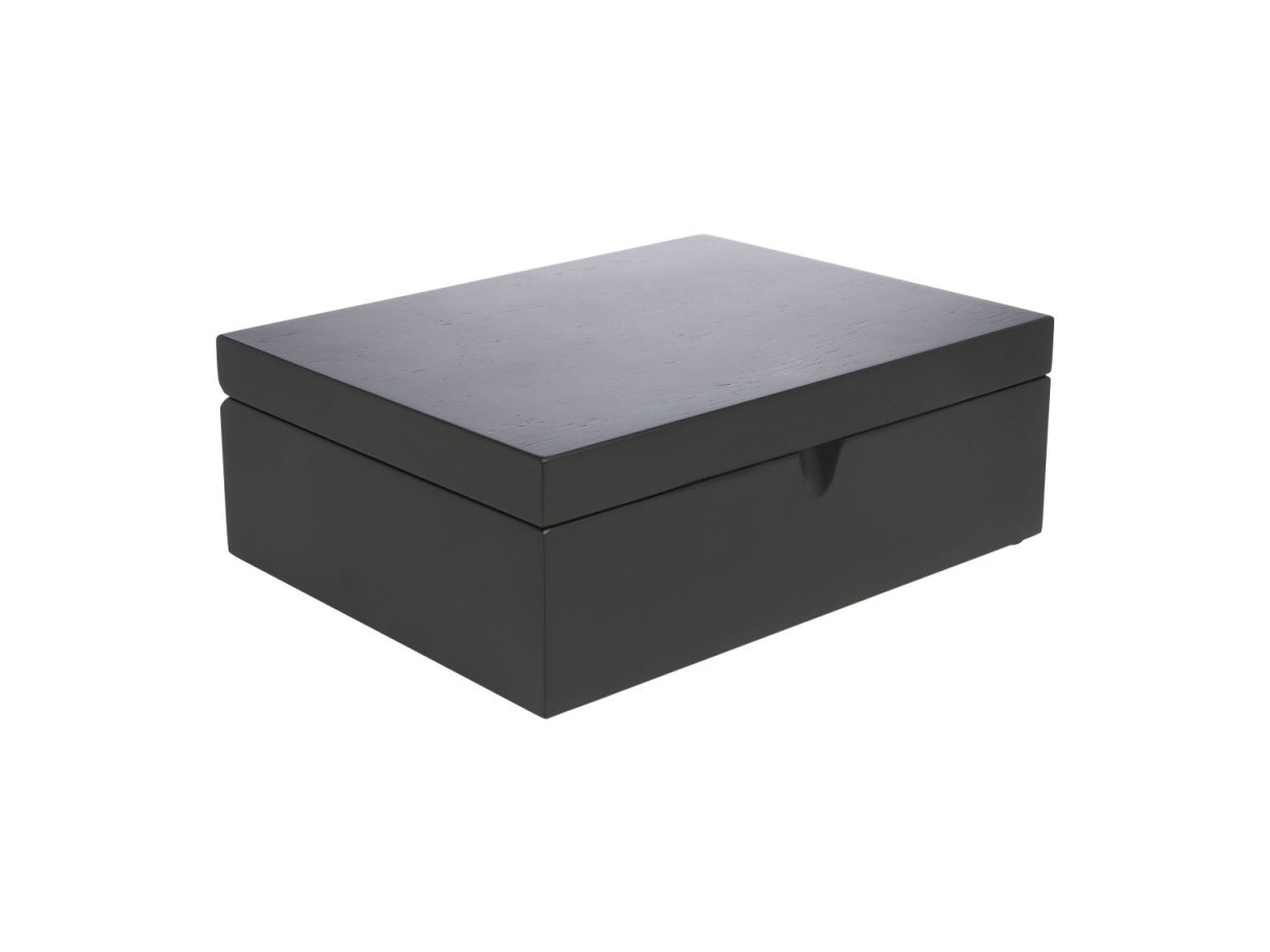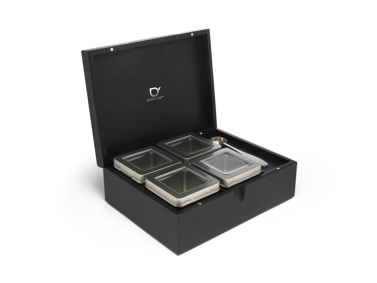 Bewaar je losse thee op stijlvolle wijze met deze zwarte Bredemeijer® theedoos. De theedoos is voorzien van 4 blikjes en speciaal ontwikkeld voor het bewaren van losse thee. Zo blijft de thee langer houdbaar en blijft de smaak behouden. Met de bijhorende theelepel schep je de thee makkelijk uit de blikjes en dankzij de doorzichtige vensters, zie je precies welke thee in welk doosje zit. Door het uitgeslepen gootje aan de voorzijde, is de deksel makkelijk te openen. De theedoos is gemaakt van bamboe en heeft een stijlvol uitstraling door de matte zwarte kleur. Een musthave voor de echte theeliefhebber!