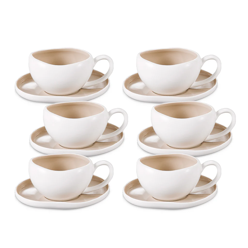 Deze stijlvolle Curvy espressoset in een verfijnde wit-beige tint combineert organische vormen met een warme, moderne uitstraling. De zachte kleurvariatie geeft elk kopje een natuurlijke elegantie, terwijl de unieke golvende vorm van het servies zorgt voor een speels maar luxueus karakter. De 120 ml kopjes zijn ideaal voor espresso, Turkse koffie en ristretto’s, en liggen dankzij hun afgeronde vorm comfortabel in de hand. De bijpassende schotels volgen dezelfde organische lijnvoering en bieden ruimte voor een lepeltje of een klein zoetigheidje. Deze 12-delige set voor 6 personen is gemaakt van duurzaam, hoogwaardig keramiek en geeft elk koffiemoment een stijlvolle en moderne uitstraling. Perfect voor dagelijks gebruik én voor het serveren van koffie aan gasten in een verfijnde setting.