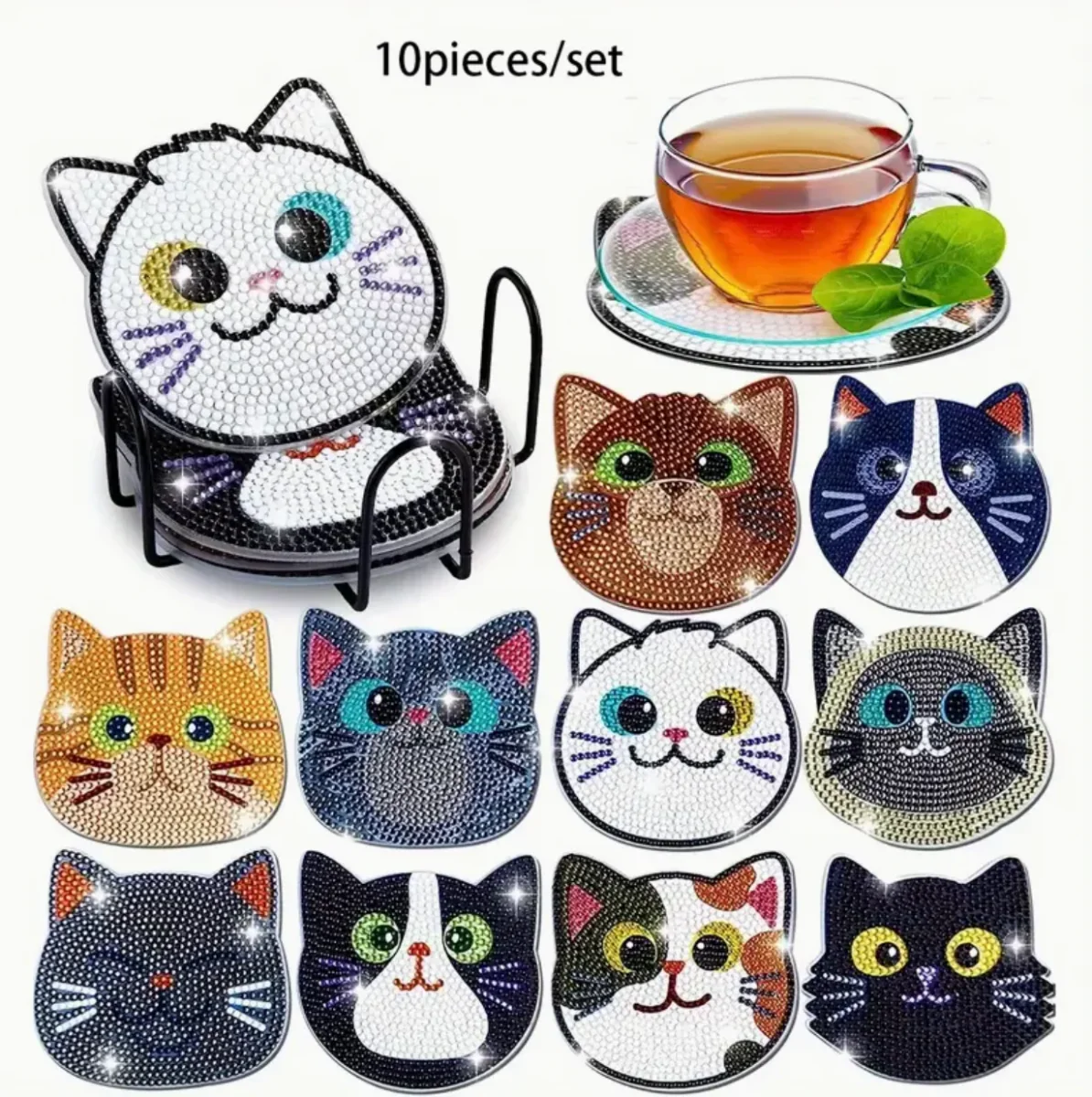 Voeg een vleugje ✨glans en charme🐾 toe aan je interieur met deze 10-delige set houten onderzetters in de vorm van schattige kattenkopjes 🐱 – perfect voor liefhebbers van diamond painting 💎! Elke onderzetter heeft een uniek kattengezichtje dat je zelf kunt versieren met schitterende strass-steentjes 🌟. Ideaal voor creatieve doe-het-zelvers 🎨, deze onderzetters combineren functionaliteit met plezier 😻 en zijn ook geweldig als handgemaakt cadeau 🎁. Inclusief metalen standaard voor een stijlvolle presentatie en handige opberging 🧺.
