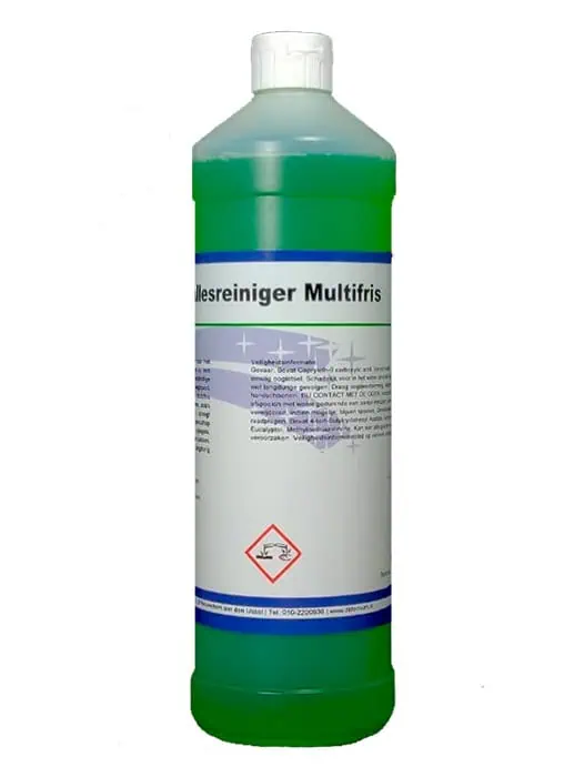 Wanneer je schoonmaakt met Allesreiniger met Multifris parfum dan weten de mensen dat je bent geweest. In tegenstelling tot andere reinigers blijft de intens frisse geur van deze allesreiniger langer hangen. Ideaal ook voor het gebruik in openbare ruimtes, zoals trappenhuizen, galerijen en liften. Uiteraard ook prima voor kantoorgebouwen. Puur of verdund met water kunt u de Allesreiniger Multifris ook gebruiken als luchtverfrisser. Gebruik hiervoor een flacon met een verstuiver.