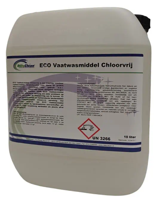ECO Vaatwasmiddel is een krachtig vloeibaar vaatwasmiddel, respectievelijk voor kleine en grotere afwasmachines, uitsluitend voor gebruik d.m.v. doseerapparatuur. Naast een groot reinigend vermogen voor vetten en eiwitten heeft ECO Vaatwasmiddel een effectieve werking om ieder probleem op het gebied van koffie- en theeaanslag aan te kunnen. Er zijn metaal beschermende en kalkbindende bestanddelen in ECO Vaatwasmiddel aanwezig. Het economische verbruik van Vaatwasmiddel Chloorvrij is vooral bij bandmachines onovertroffen. pH waarde 13. Lege verpakking aanbieden als plastic afval voor hergebruik.
