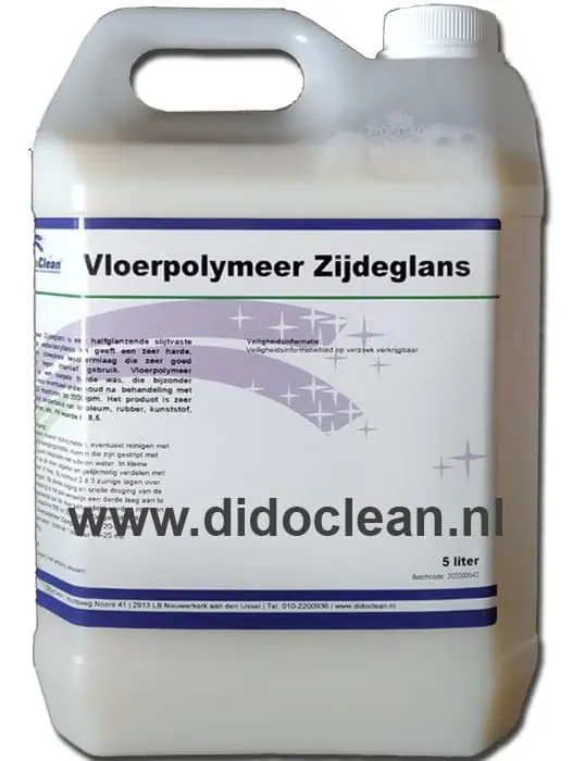 DiDoClean Vloerpolymeer Zijdeglans 5L is geschikt voor onderhoud van linoleum, kunststof, marmer, graniet, plavuizen, tegelvloeren, etc. DiDoClean Vloerpolymeer Zijdeglans 5L is een gemetalliseerde polymeer, slijtvaste vloerwas, die zeer goed bestand is tegen inwerking van vuil en intensief gebruik. DiDoClean Vloerpolymeer Zijdeglans 5L is een soepele harde vloerwas geschikt voor vloeren waar antislip een vereiste is. DiDoClean Vloerpolymeer Zijdeglans 5L is bijzonder geschikt voor behandeling met een High-speed machine tot 2000 tpm.