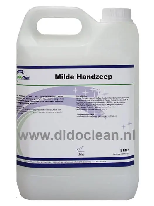 DiDoClean Milde huidvriendelijke Handzeep 5 liter bestaat uit een combinatie van huidvriendelijke en reinigende actieve grondstoffen. Deze vloeibare handzeep is precies wat je van een fijne handzeep mag verwachten. De zeep heeft een wat dikkere, gelachtige lotion structuur en heeft een heerlijk frisse geur. Milde voor de handen, dus prima geschikt voor uw gasten. Deze lotion zeep van hoge kwaliteit heeft een neutrale pH waarde vergelijkbaar met die van de huid. Hierdoor is de zeep een prima reinigingsmiddel voor de handen en geschikt voor dagelijks gebruik.