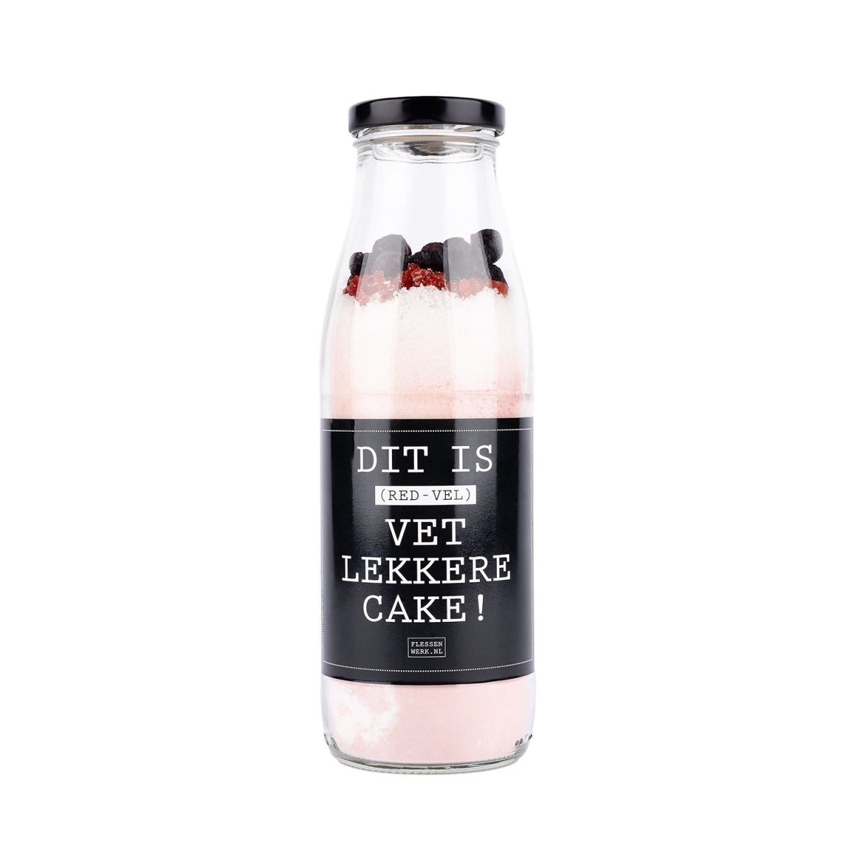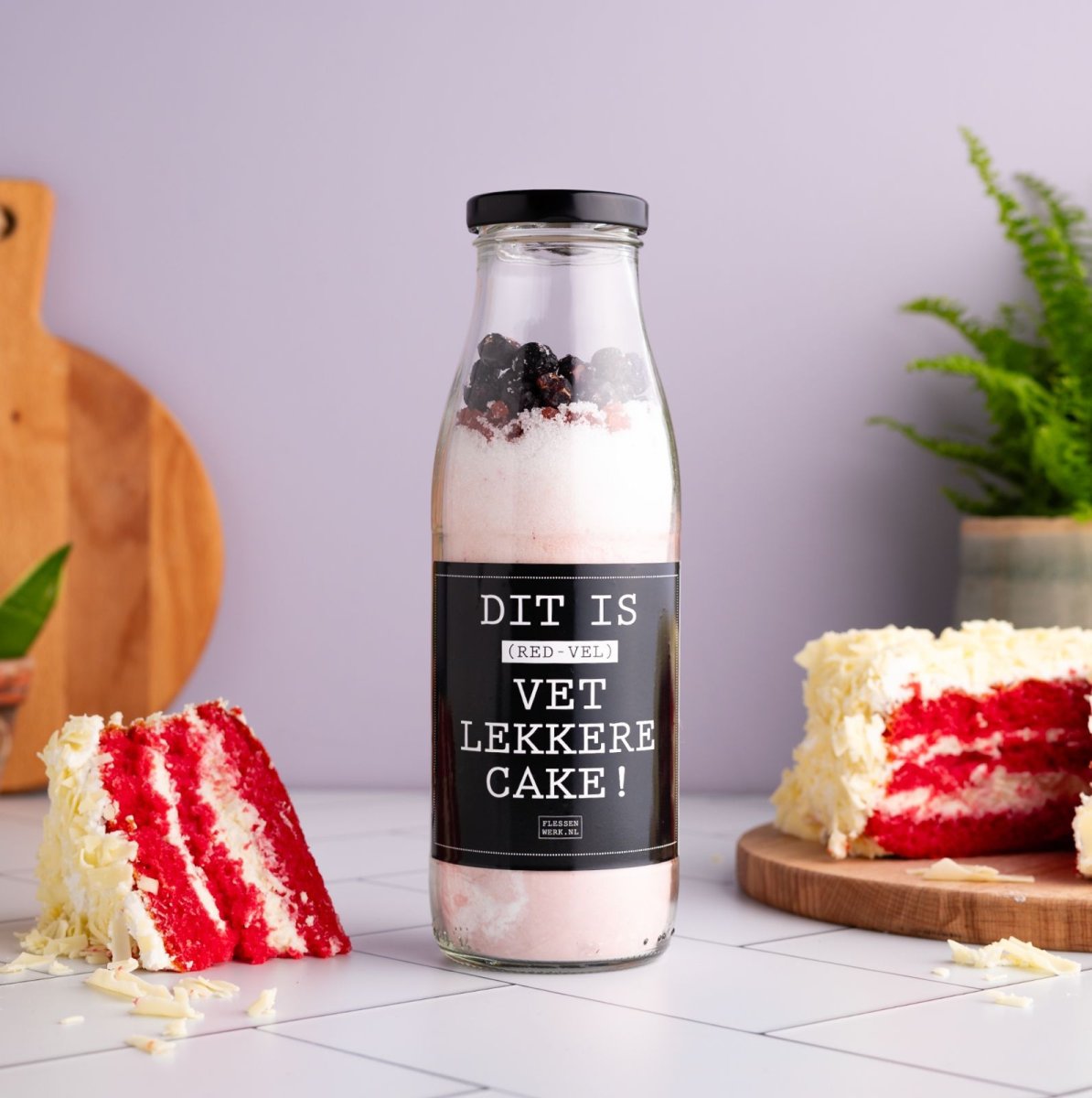 Kadootjes die eruit zien om op te eten – letterlijk! In dit leuke flesje van Flessenwerk met zwart etiket en de tekst ‘Dit is Red-velvet lekkere cake!’ zit een heerlijk kant-en-klaar bakrecept voor een red velvet cake. Leuk om te geven of zelf te bakken.