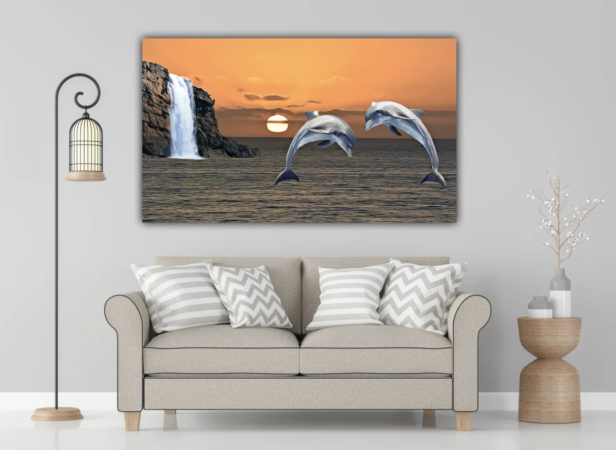 Laat je meevoeren door de serene schoonheid van deze magische scène. Twee sierlijke dolfijnen springen speels uit het kalme water terwijl de zon langzaam ondergaat aan de horizon 🌞. Op de achtergrond stroomt een majestueuze waterval van een steile rotswand, die het beeld extra kracht en rust geeft 🌊🪨. De warme tinten van de lucht mengen zich harmonieus met het zilvergrijs van de dolfijnen, wat dit ontwerp perfect maakt voor een ontspannende en elegante diamond painting.