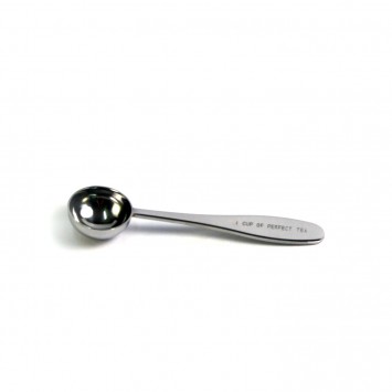 Eén schep thee met deze doseerlepel is precies de juiste hoeveelheid voor een kop thee. Maatlepel met tekst “1 cup of perfect tea”.