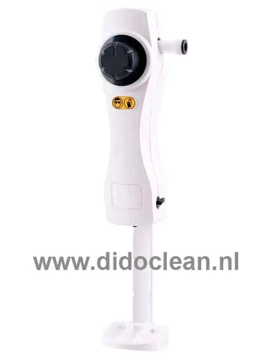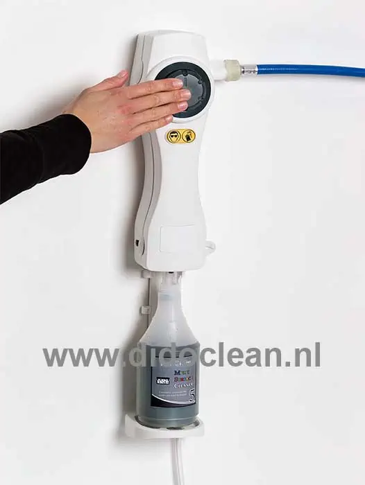 Doseerpomp, die verhoudingsgewijs doseert en die rechtstreeks aan de waterleiding is aangesloten. Met push knop, die eventueel vast te zetten is. Met opzetstuk voor de sprayflacon. Doseert een vooraf ingestelde hoeveelheid chemicaliën naar de uiteindelijke kant-en-klare oplossing. Een waterdruk tussen 1,5 en 3 bar (20 en 70 PSI) is vereist. Wordt zonder cabinet geleverd. Low flow uitvoering, doseert 4 liter per minuut. Verdunningsgraad: 2:1 190:1