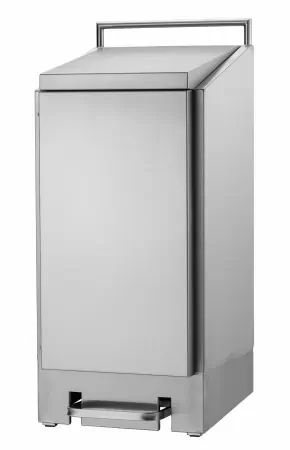 Dubbelwandige afvalzakhouder, vrijstaand model. Wordt met binnenring geleverd. Met voetbediening, 2 wielen en zacht sluitende deksel. Vaatwasser geschikt en HACCP goedgekeurd.
