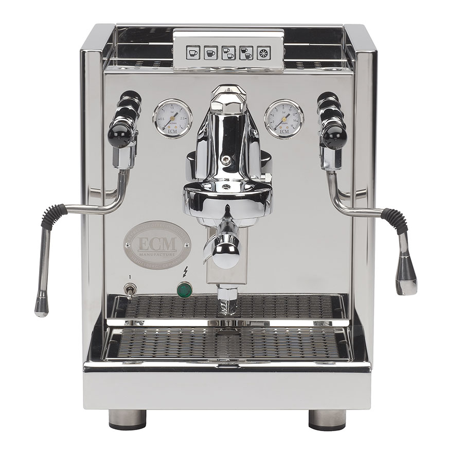 Het is kortom de perfecte espressomachine voor de veeleisende gebruiker. Door de instelbare doorlooptijd zet je met één druk op de knop een perfecte koffie. Uiteraard voldoet deze machine aan de design standaarden van ECM: strak ontwerp, hoogwaardige materialen en afwerking en unieke eigenschappen. Door de hendels voor stoom en heet water krijgt de machine een professionele en robuuste uitstraling. Door het openen van de koppenwarmer kan je het 3 liter waterreservoir eenvoudig vullen. De warmtewisselaar maakt het mogelijke tegelijkertijd koffie te zetten en melk op te schuimen. Hoge eisen aan veelzijdigheid, professionaliteit en exclusiviteit? De Elektronika II van ECM levert op alle fronten![/vc_column_text][vc_column_text]• Klassieke hoogglanzende drukgroep van massief messing