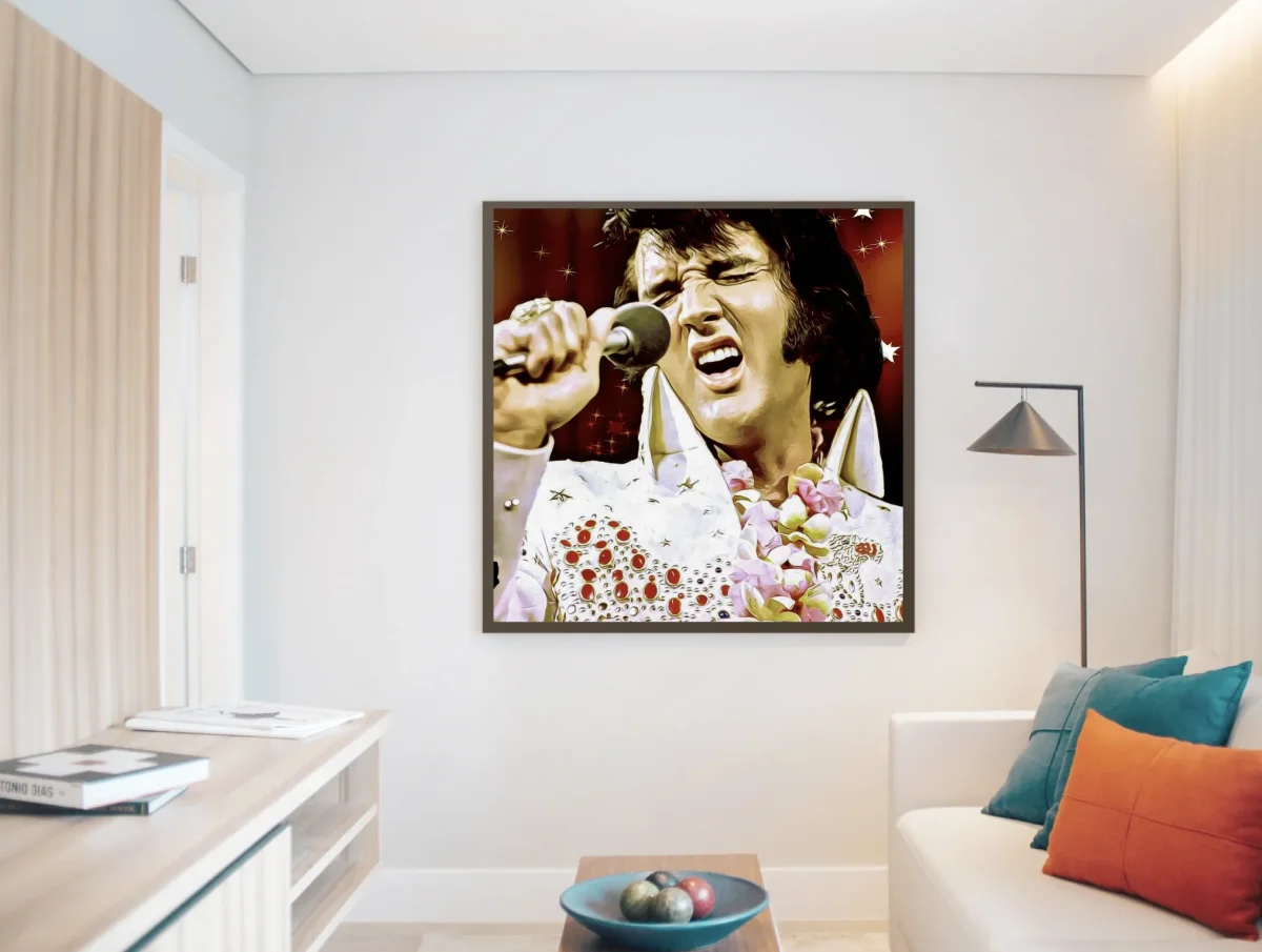🎤👑 Een fonkelend eerbetoon aan de legendarische Elvis Presley, de onbetwiste King of Rock ’n Roll! In deze sprankelende diamond painting zie je Elvis in zijn iconische witte outfit ✨, versierd met kleurrijke bloemen 🌺 en glinsterende details. Elk steentje brengt zijn charisma en het podiumgevoel tot leven — een schitterend stuk voor elke muziek- of retrofan! 🎶🌟