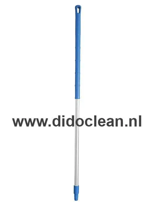 De Ergonomische Steel Aluminium 150cm BLAUW heeft aan het uiteinde een schroefdraad voor aansluiting op bezems, borstels en schrapers. Deze steel is gemaakt van geanodiseerde aluminium en voorzien van een blauwe Polypropyleen grip