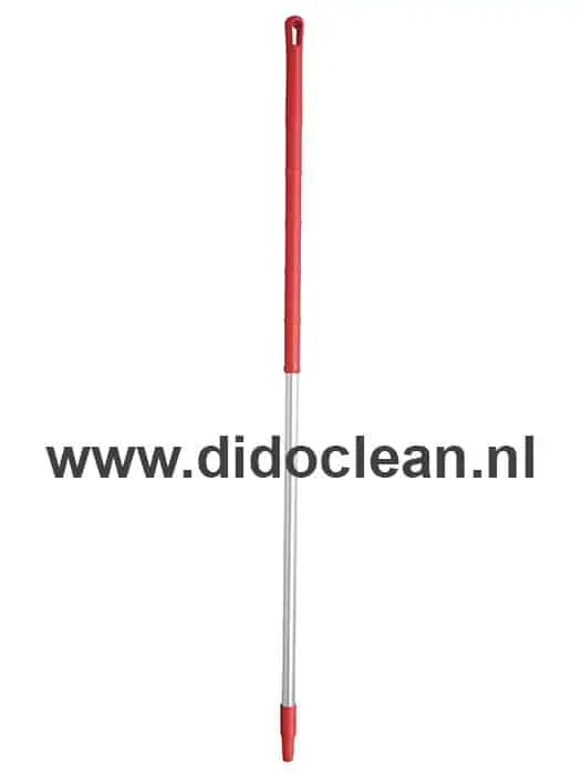 De Ergonomische Steel Aluminium 150cm ROOD heeft aan het uiteinde een schroefdraad voor aansluiting op bezems, borstels en schrapers. Deze steel is gemaakt van geanodiseerde aluminium en voorzien van een rode Polypropyleen grip