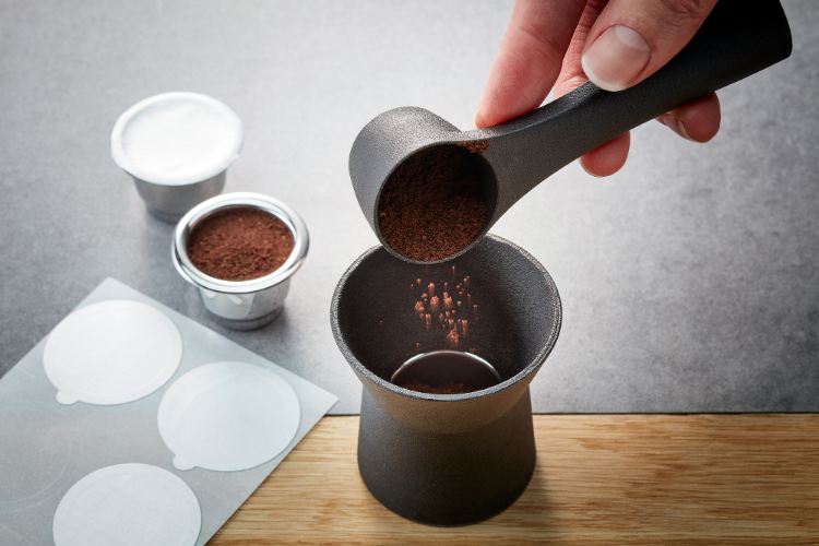 Je eigen favoriete koffie in zelfgemaakte herbruikbare capsules voor je Nespresso apparaat. Duurzaam en geld besparend, maar hoe werkt het eigenlijk? Plaats de trechter op een lege capsule, vul de capsule met je favoriete koffie of espresso poeder door middel van de maatlepel en druk dit aan met de stamper, verzegel de capsule met de zelfklevende aroma zegel en je bent klaar om koffie te zetten. Na gebruik verwijder je eenvoudig de zegel waardoor je de capsule kunt reinigen en direct weer kunt gebruiken. De set is gemaakt van hoogwaardig RVS, kunststof en aluminium. Alle onderdelen zijn geschikt voor de vaatwasser (behalve de aroma zegels).