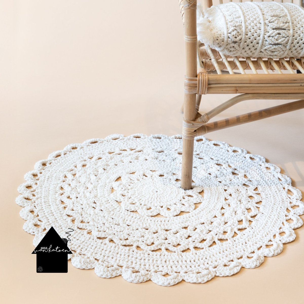 Afmeting: ca 80/100 cm doorsnee (afhankelijk van hand van haken, haaknaald en garen)
