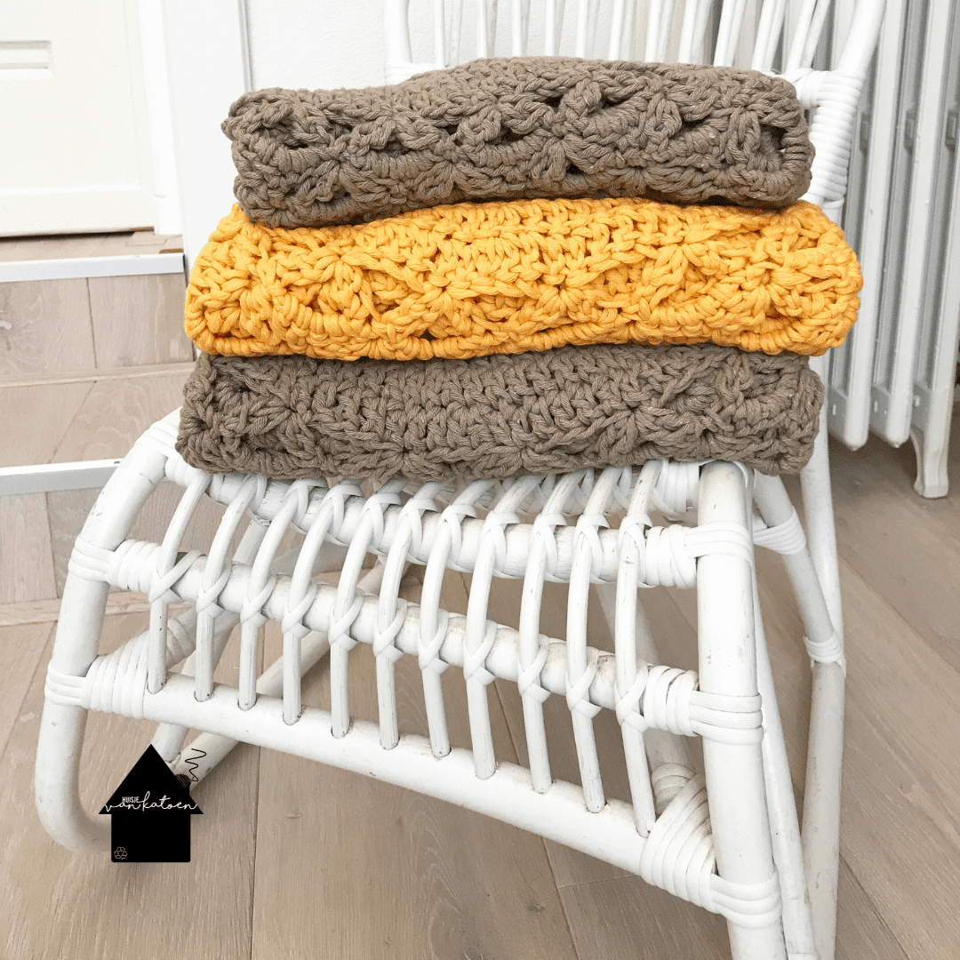 Wastip: haak bij een groot project wat je graag wilt wassen, eerst een proeflapje en was deze op het aantal graden dat je zou willen. Doordat het garen uit ca 20% andere vezels bestaat is het niet te zeggen of en zo ja hoeveel het krimpt. Als proef zijn er 2 verschillende kleuren vaatdoekjes gehaakt en gewassen op 60 graden. De een is ca 1 cm gekrompen en de ander helemaal niet