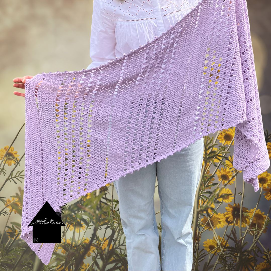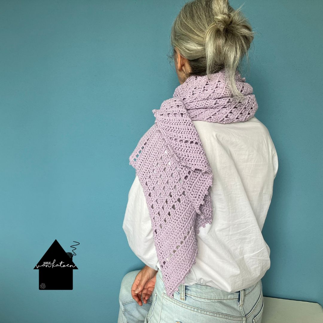 Deze sjaal is op de bias gehaakt, waardoor het patroon wat je erin haakt schuin loopt. De steken zijn niet moeilijk maar het is wel van belang dat je regelmatig checkt of je nog op het juiste aantal steken zit.