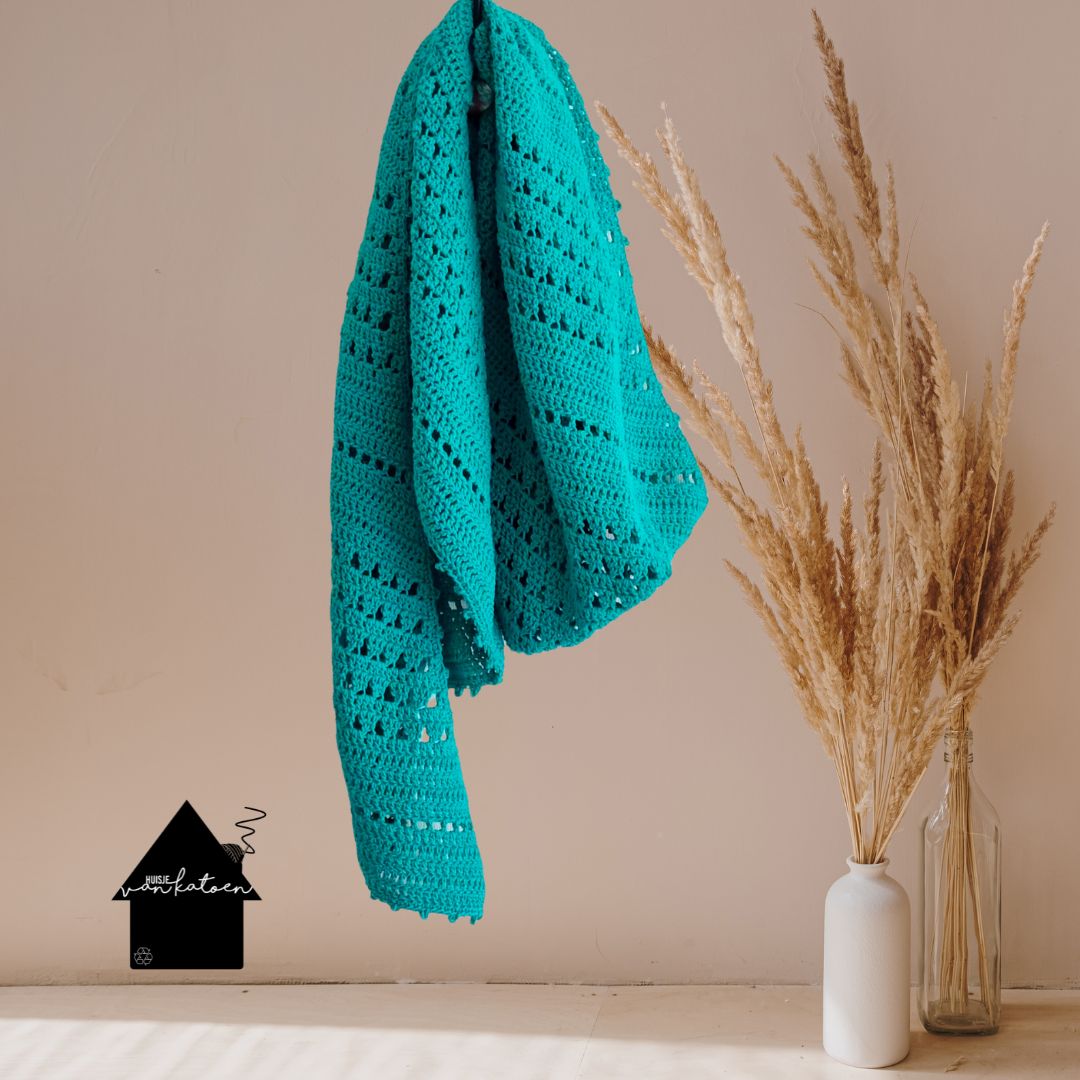 Afmeting: ca 50/165 cm (dit is uiteraard afhankelijk van gebruikte haaknaald en hand van haken)